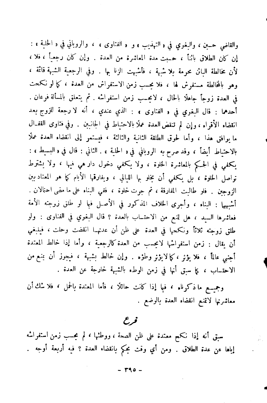 ثُمَّ يَتَعَلَّقُ بِالْمَسْأَلَةِ فَرْعَانِ. أَحَدُهُمَا: قَالَ الْبَغَوِيُّ فِي «الْفَتَاوَى» : الَّذِي عِنْدِي، أَنَّهُ لَا رَجْعَةَ لِلزَّوْجِ بَعْدَ انْقِضَاءِ الْأَقْرَاءِ، وَإِنْ لَمْ تَنْقَضِ الْعِدَّةُ عَمَلًا بِالِاحْتِيَاطِ فِي الْجَانِبَيْنِ. وَفِي فَتَاوَى الْقَفَّالِ مَا يُوَافِقُ هَذَا، وَأَمَّا لُحُوقُ الطَّلْقَةِ الثَّانِيَةِ وَالثَّالِثَةِ، فَيَسْتَمِرُّ إِلَى انْقِضَاءِ الْعِدَّةِ عَمَلًا بِالِاحْتِيَاطِ أَيْضًا، وَقَدْ صَرَّحَ بِهِ الرُّويَانِيُّ فِي الْحِلْيَةِ. الثَّانِي: قَالَ فِي الْبَسِيطِ: يَكْفِي فِي الْحُكْمِ بِالْمُعَاشَرَةِ الْخَلْوَةُ، وَلَا يَكْفِي دُخُولُ دَارٍ هِيَ فِيهَا، وَلَا يُشْتَرَطُ تَوَاصُلُ الْخَلْوَةِ، بَلْ يَكْفِي أَنْ يَخْلُوَ بِهَا اللَّيَالِيَ، وَيُفَارِقَهَا الْأَيَّامَ كَمَا هُوَ الْمُعْتَادُ بَيْنَ الزَّوْجَيْنِ. فَلَوْ طَالَبَتِ الْمُفَارَقَةَ، ثُمَّ جَرَتْ خَلْوَةٌ، فَفِي الْبِنَاءِ عَلَى مَا مَضَى احْتِمَالَانِ. أَشْبَهُهُمَا: الْبِنَاءُ، وَأَجْرَى الْخِلَافَ الْمَذْكُورَ فِي الْأَصْلِ فِيمَا لَوْ طَلَّقَ زَوْجَتَهُ الْأَمَةَ فَعَاشَرَهَا السَّيِّدُ، هَلْ تُمْنَعُ مِنَ الِاحْتِسَابِ بِالْعِدَّةِ؟ قَالَ الْبَغَوِيُّ فِي «الْفَتَاوَى» : وَلَوْ طَلَّقَ زَوْجَتَهُ ثَلَاثًا وَنَكَحَهَا فِي الْعِدَّةِ عَلَى ظَنِّ أَنَّ عِدَّتَهَا انْقَضَتْ وَحَلَّتْ، فَيَنْبَغِي أَنْ يُقَالَ: زَمَنُ اسْتِفْرَاشِهَا لَا يُحْسَبُ مِنَ الْعِدَّةِ كَالرَّجْعِيَّةِ، وَأَمَّا إِذَا خَالَطَ الْمُعْتَدَّةَ أَجْنَبِيٌّ عَالِمًا، فَلَا يُؤَثِّرُ، كَمَا لَا يُؤَثِّرُ وَطْؤُهُ. وَإِنْ خَالَطَ بِشُبْهَةٍ، فَيَجُوزُ أَنْ يُمْنَعَ مِنَ الِاحْتِسَابِ، كَمَا سَبَقَ أَنَّهَا فِي زَمَنِ الْوَطْءِ بِالشُّبْهَةِ خَارِجَةٌ عَنِ الْعِدَّةِ.