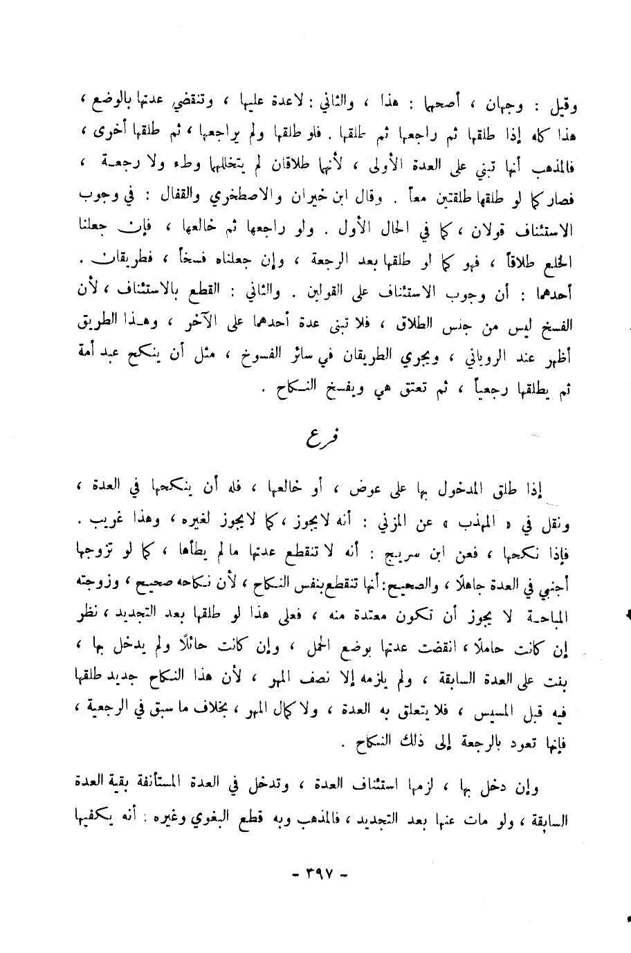 وَقِيلَ: وَجْهَانِ، أَصَحُّهُمَا: هَذَا، وَالثَّانِي: لَا عِدَّةَ عَلَيْهَا، وَتَنْقَضِي عِدَّتُهَا بِالْوَضْعِ، هَذَا كُلُّهُ إِذَا طَلَّقَهَا ثُمَّ رَاجَعَهَا ثُمَّ طَلَّقَهَا. فَلَوْ طَلَّقَهَا وَلَمْ يُرَاجِعْهَا، ثُمَّ طَلَّقَهَا أُخْرَى، فَالْمَذْهَبُ أَنَّهَا تَبْنِي عَلَى الْعِدَّةِ الْأُولَى، لِأَنَّهُمَا طَلَاقَانِ لَمْ يَتَخَلَّلْهُمَا وَطْءٌ وَلَا رَجْعَةٌ، فَصَارَ كَمَا لَوْ طَلَّقَهَا طَلْقَتَيْنِ مَعًا. وَقَالَ ابْنُ خَيْرَانَ وَالْإِصْطَخْرِيُّ وَالْقَفَّالُ: فِي وُجُوبِ الِاسْتِئْنَافِ قَوْلَانِ، كَمَا فِي الْحَالِ الْأَوَّلِ. وَلَوْ رَاجَعَهَا ثُمَّ خَالَعَهَا، فَإِنْ جَعَلْنَا الْخُلْعَ طَلَاقًا، فَهُوَ كَمَا لَوْ طَلَّقَهَا بَعْدَ الرَّجْعَةِ، وَإِنْ جَعَلْنَاهُ فَسْخًا، فَطَرِيقَانِ. أَحَدُهُمَا: أَنَّ وُجُوبَ الِاسْتِئْنَافِ عَلَى الْقَوْلَيْنِ. وَالثَّانِي: الْقَطْعُ بِالِاسْتِئْنَافِ، لِأَنَّ الْفَسْخَ لَيْسَ مِنْ جِنْسِ الطَّلَاقِ، فَلَا تُبْنَى عِدَّةُ أَحَدِهِمَا عَلَى الْآخَرِ، وَهَذَا الطَّرِيقُ أَظْهَرُ عِنْدَ الرُّويَانِيِّ، وَيَجْرِي الطَّرِيقَانِ فِي سَائِرِ الْفُسُوخِ، مِثْلَ أَنْ يَنْكِحَ عَبْدٌ أَمَةً ثُمَّ يُطَلِّقَهَا رَجْعِيًّا، ثُمَّ تَعْتِقَ هِيَ وَيُفْسَخَ النِّكَاحُ.