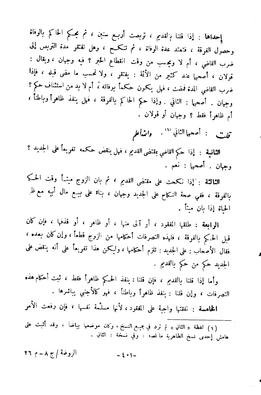 إِحْدَاهَا: إِذَا قُلْنَا بِالْقَدِيمِ، تَرَبَّصَتْ أَرْبَعَ سِنِينَ، ثُمَّ يَحْكُمُ الْحَاكِمُ بِالْوَفَاةِ وَحُصُولِ الْفُرْقَةِ، فَتَعْتَدُّ عِدَّةَ الْوَفَاةِ، ثُمَّ تَنْكِحُ، وَهَلْ تَفْتَقِرُ مُدَّةُ التَّرَبُّصِ إِلَى ضَرْبِ الْقَاضِي، أَمْ لَا وَيُحْسَبُ مِنْ وَقْتِ انْقِطَاعِ الْخَبَرِ؟ فِيهِ وَجْهَانِ، وَيُقَالُ: قَوْلَانِ، أَصَحُّهُمَا عِنْدَ كَثِيرٍ مِنَ الْأَئِمَّةِ: يُفْتَقَرُ، وَلَا تَحْسِبُ مَا مَضَى قَبْلَهُ، فَإِذَا ضَرَبَ الْقَاضِي الْمُدَّةَ فَمَضَتْ، فَهَلْ يَكُونُ حُكْمًا بِوَفَاتِهِ، أَمْ لَا بُدَّ مِنِ اسْتِئْنَافِ حُكْمٍ؟ وَجْهَانِ. أَصَحُّهُمَا: الثَّانِي. وَإِذَا حَكَمَ الْحَاكِمُ بِالْفُرْقَةِ، فَهَلْ يُنَفَّذُ ظَاهِرًا وَبَاطِنًا، أَمْ ظَاهِرًا فَقَطْ؟ وَجْهَانِ أَوْ قَوْلَانِ.