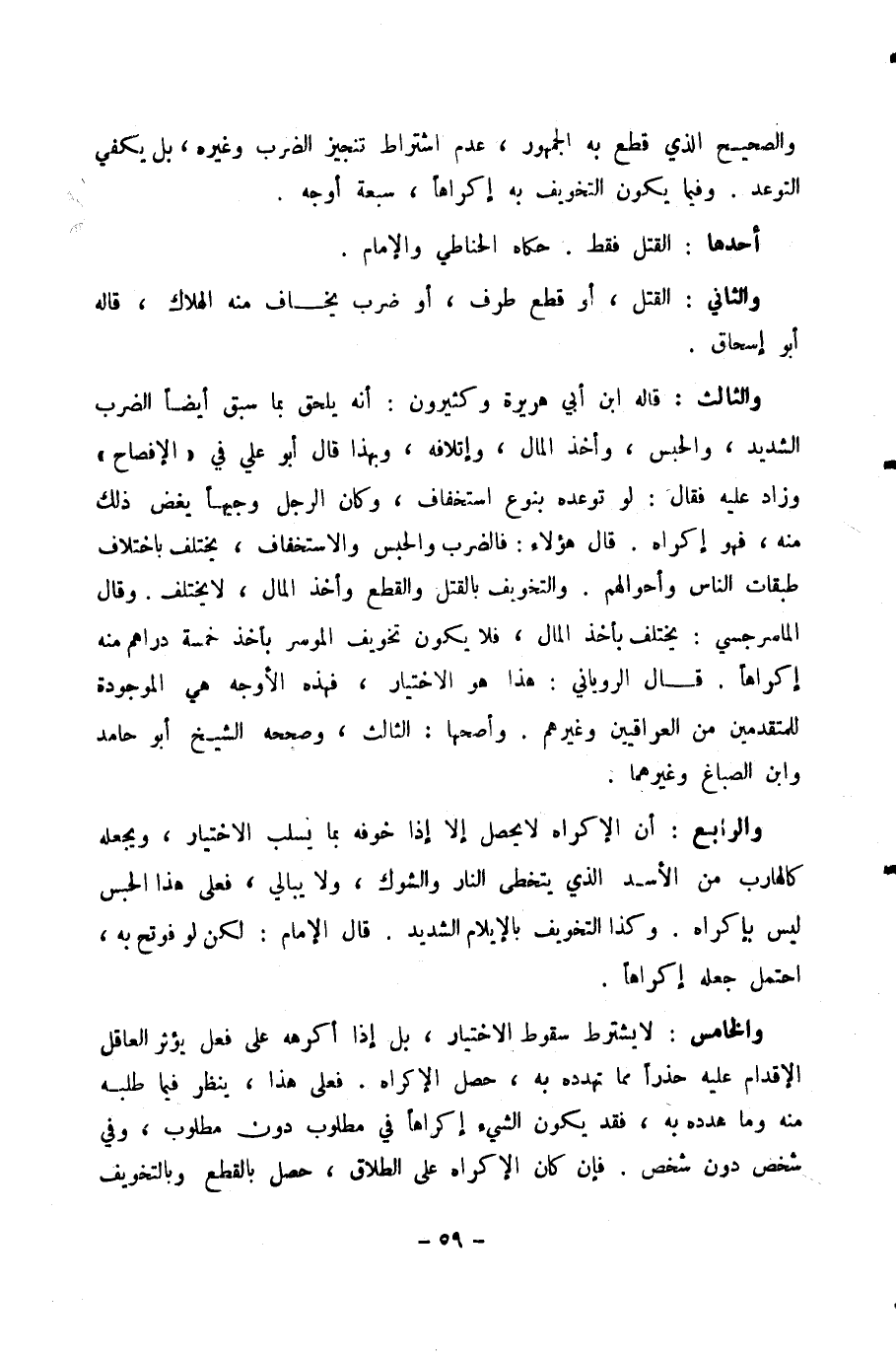 وَالثَّالِثُ: قَالَهُ ابْنُ أَبِي هُرَيْرَةَ وَكَثِيرُونَ: أَنَّهُ يُلْحَقُ بِمَا سَبَقَ أَيْضًا الضَّرْبُ الشَّدِيدُ، وَالْحَبْسُ، وَأَخْذُ الْمَالِ، وَإِتْلَافُهُ، وَبِهَذَا قَالَ أَبُو عَلِيٍّ فِي «الْإِفْصَاحِ» وَزَادَ عَلَيْهِ فَقَالَ: لَوْ تَوَعَّدَهُ بِنَوْعِ اسْتِخْفَافٍ، وَكَانَ الرَّجُلُ وَجِيهًا يَغُضُّ ذَلِكَ مِنْهُ، فَهُوَ إِكْرَاهٌ. قَالَ هَؤُلَاءِ: فَالضَّرْبُ وَالْحَبْسُ وَالِاسْتِخْفَافُ، يَخْتَلِفُ بِاخْتِلَافِ طَبَقَاتِ النَّاسِ وَأَحْوَالِهِمْ. وَالتَّخْوِيفُ بِالْقَتْلِ وَالْقَطْعِ وَأَخْذِ الْمَالِ، لَا يَخْتَلِفُ. وَقَالَ الْمَاسَرْجِسِيُّ: يَخْتَلِفُ بِأَخْذِ الْمَالِ، فَلَا يَكُونُ تَخْوِيفُ الْمُوسِرِ بِأَخْذِ خَمْسَةِ دَرَاهِمَ مِنْهُ إِكْرَاهًا، قَالَ الرُّويَانِيُّ: هَذَا هُوَ الِاخْتِيَارُ، فَهَذِهِ الْأَوْجُهُ هِيَ الْمَوْجُودَةُ لِلْمُتَقَدِّمِينَ مِنَ الْعِرَاقِيِّينَ وَغَيْرِهِمْ. وَأَصَحُّهَا: الثَّالِثُ، وَصَحَّحَهُ الشَّيْخُ أَبُو حَامِدٍ وَابْنُ الصَّبَّاغِ وَغَيْرُهُمَا.