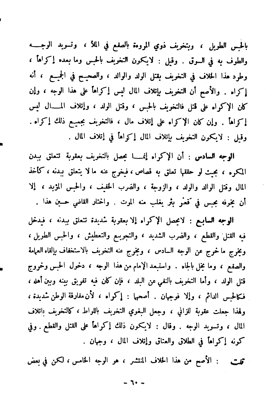 الْوَجْهُ السَّابِعُ: لَا يَحْصُلُ الْإِكْرَاهُ إِلَّا بِعُقُوبَةٍ شَدِيدَةٍ تَتَعَلَّقُ بِبَدَنِهِ، فَيَدْخُلُ فِيهِ الْقَتْلُ وَالْقَطْعُ، وَالضَّرْبُ الشَّدِيدُ، وَالتَّجْوِيعُ وَالتَّعْطِيشُ، وَالْحَبْسُ الطَّوِيلُ، وَيَخْرُجُ مَا خَرَجَ عَنِ الْوَجْهِ السَّادِسِ، وَيَخْرُجُ عَنْهُ التَّخْوِيفُ بِالِاسْتِخْفَافِ بِإِلْقَاءِ الْعِمَامَةِ وَالصَّفْعِ، وَمَا يُخِلُّ بِالْجَاهِ. وَاسْتَبْعَدَ الْإِمَامُ مِنْ هَذَا الْوَجْهِ، دُخُولَ الْحَبْسِ وَخُرُوجَ قَتْلِ الْوَلَدِ، وَأَمَّا التَّخْوِيفُ بِالنَّفْيِ عَنِ الْبَلَدِ، فَإِنْ كَانَ فِيهِ تَفْرِيقٌ بَيْنَهُ وَبَيْنَ أَهْلِهِ، فَكَالْحَبْسِ الدَّائِمِ، وَإِلَّا فَوَجْهَانِ. أَصَحُّهُمَا: إِكْرَاهٌ، لِأَنَّ مُفَارَقَةَ الْوَطَنِ شَدِيدَةٌ، وَلِهَذَا جُعِلَتْ عُقُوبَةً لِلزَّانِي، وَجَعَلَ الْبَغْوَيُّ التَّخْوِيفَ بِاللِّوَاطِ، كَالتَّخْوِيفِ بِإِتْلَافِ الْمَالِ، وَتَسْوِيدِ الْوَجْهِ. وَقَالَ: لَا يَكُونُ ذَلِكَ إِكْرَاهًا عَلَى الْقَتْلِ وَالْقَطْعِ. وَفِي كَوْنِهِ إِكْرَاهًا فِي الطَّلَاقِ وَالْعِتَاقِ وَإِتْلَافِ الْمَالِ، وَجْهَانِ.