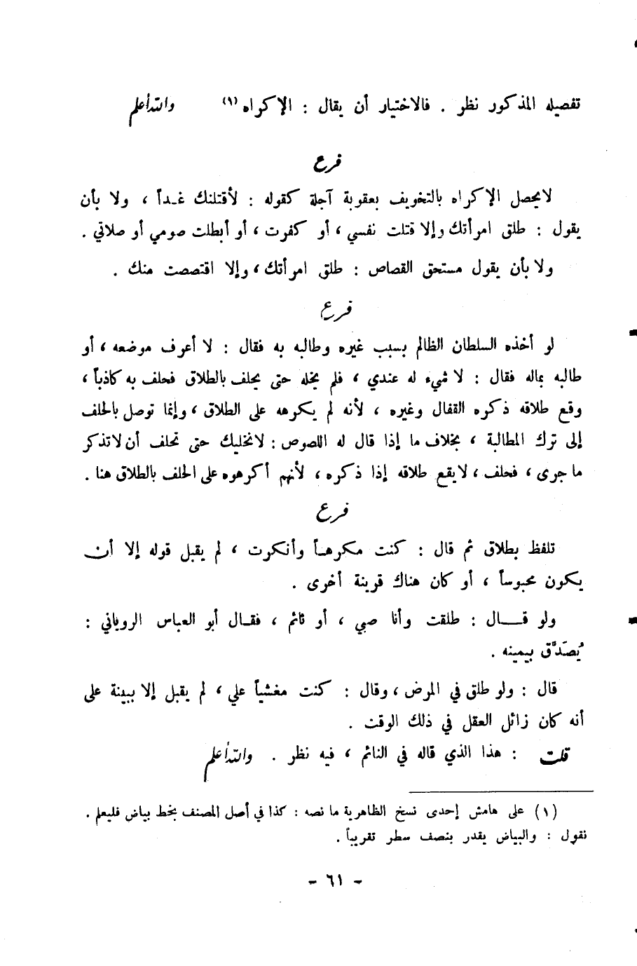 تَفْصِيلِهِ الْمَذْكُورِ نَظَرٌ. فَالِاخْتِيَارُ أَنْ يُقَالَ: الْإِكْرَاهُ. وَاللَّهُ أَعْلَمُ.