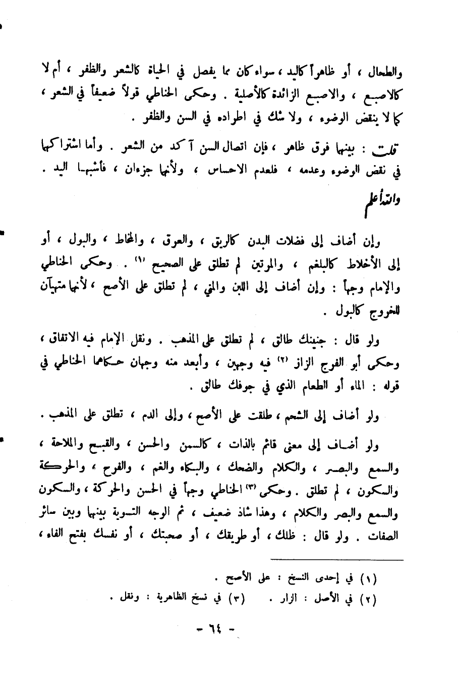 وَإِنْ أَضَافَ إِلَى فَضَلَاتِ الْبَدَنِ كَالرِّيقِ، وَالْعَرَقِ، وَالْمُخَاطِ، وَالْبَوْلِ، أَوْ إِلَى الْأَخْلَاطِ كَالْبَلْغَمِ، وَالْمِرَّتَيْنِ لَمْ تُطَلَّقْ عَلَى الصَّحِيحِ. وَحَكَى الْحَنَّاطِيُّ وَالْإِمَامُ وَجْهًا: وَإِنْ أَضَافَ إِلَى اللَّبَنِ وَالْمَنِيِّ، لَمْ تُطَلَّقْ عَلَى الْأَصَحِّ، لِأَنَّهُمَا مُتَهَيِّئَانِ لِلْخُرُوجِ كَالْبَوْلِ.