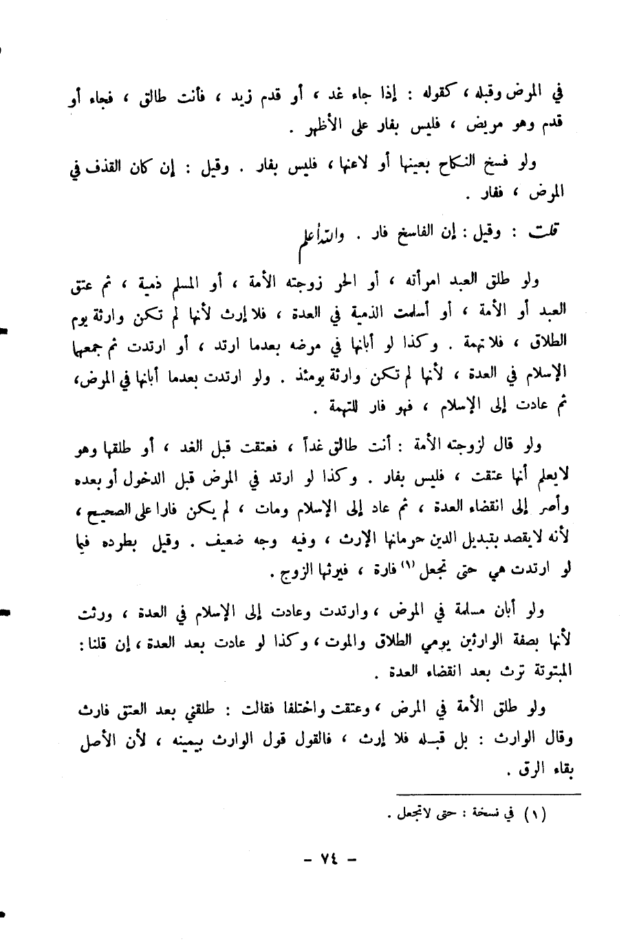 وَلَوْ قَالَ لِزَوْجَتِهِ الْأَمَةِ: أَنْتِ طَالِقٌ غَدًا، فَعَتَقَتْ قَبْلَ الْغَدِ، أَوْ طَلَّقَهَا وَهُوَ لَا يَعْلَمُ أَنَّهَا عَتَقَتْ، فَلَيْسَ بِفَارٍّ، وَكَذَا لَوِ ارْتَدَّ فِي الْمَرَضِ قَبْلَ الدُّخُولِ أَوْ بَعْدَهُ وَأَصَرَّ إِلَى انْقِضَاءِ الْعِدَّةِ، ثُمَّ عَادَ إِلَى الْإِسْلَامِ وَمَاتَ، لَمْ يَكُنْ فَارًّا عَلَى الصَّحِيحِ، لِأَنَّهُ لَا يَقْصِدُ بِتَبْدِيلِ الدِّينِ حِرْمَانَهَا الْإِرْثَ، وَفِيهِ وَجْهٌ ضَعِيفٌ. وَقِيلَ بِطَرْدِهِ فِيمَا لَوِ ارْتَدَّتْ هِيَ حَتَّى تُجْعَلَ فَارَّةً، فَيَرِثُهَا الزَّوْجُ.