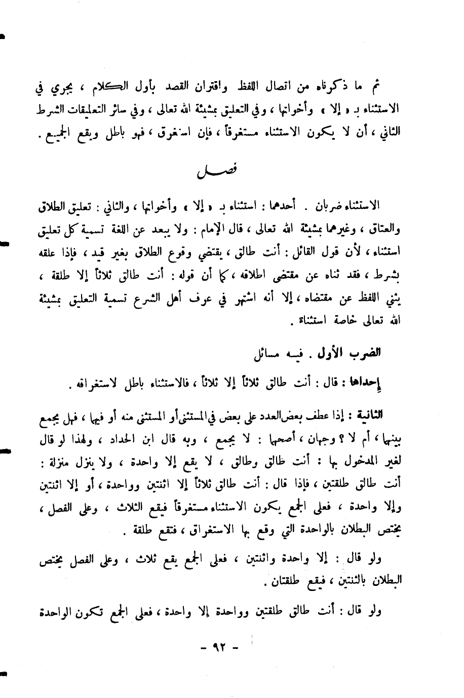 الِاسْتِثْنَاءُ ضَرْبَانِ. أَحَدُهُمَا: اسْتِثْنَاءٌ بِ «إِلَّا» وَأَخَوَاتِهَا، وَالثَّانِي: تَعْلِيقُ الطَّلَاقِ وَالْعِتَاقِ، وَغَيْرِهِمَا بِمَشِيئَةِ اللَّهِ تَعَالَى، قَالَ الْإِمَامُ: وَلَا يَبْعُدُ عَنِ اللُّغَةِ تَسْمِيَةُ كُلِّ تَعْلِيقٍ اسْتِثْنَاءً، لِأَنَّ قَوْلَ الْقَائِلِ: أَنْتِ طَالِقٌ، يَقْتَضِي وُقُوعَ الطَّلَاقِ بِغَيْرِ قَيْدٍ، فَإِذَا عَلَّقَهُ بِشَرْطٍ، فَقَدْ ثَنَّاهُ عَنْ مُقْتَضَى إِطْلَاقِهِ، كَمَا أَنَّ قَوْلَهُ: أَنْتِ طَالِقٌ ثَلَاثًا إِلَّا طَلْقَةً، يُثَنِّي اللَّفْظَ عَنْ مُقْتَضَاهُ، إِلَّا أَنَّهُ اشْتُهِرَ فِي عُرْفِ أَهْلِ الشَّرْعِ تَسْمِيَةُ التَّعْلِيقِ بِمَشِيئَةِ اللَّهِ تَعَالَى خَاصَّةً اسْتِثْنَاءً.