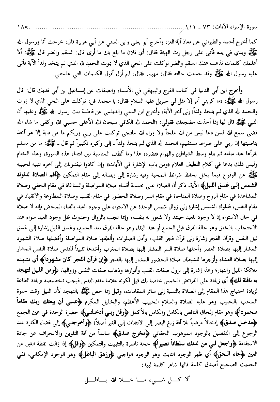 هذا وما ألطف المناسبة بين ابتداء هذه السورة، وهذا الختام وليس ذلك بدعا في كلام اللطيف العلام «ومن باب الإشارة في الآيات» وإن كادوا ليفتنونك إلى آخره تنبيه لحبيبه صلّى الله عليه وسلّم عن الوقوع فيما يخل بحفظ شرائط المحبة وفيه إشارة إلى إيصاله إلى مقام التمكين أَقِمِ الصَّلاةَ لِدُلُوكِ الشَّمْسِ إِلى غَسَقِ اللَّيْلِ الآية، ذكر أن الصلاة على خمسة أقسام صلاة المواصلة والمناغاة في مقام الخفي وصلاة المشاهدة في مقام الروح وصلاة المناجاة في مقام السر وصلاة الحضور في مقام القلب وصلاة المطاوعة والانقياد في مقام النفس، فدلوك الشمس إشارة إلى زوال شمس الوحدة عن الاستواء على وجود العبد بالفناء المحض فإنه لا صلاة في حال الاستواء إذ لا وجود للعبد حينئذ ولا شعور له بنفسه، وإنما تجب بالزوال وحدوث ظل وجود العبد سواء عند الاحتجاب بالخلق وهو حالة الفرق قبل الجمع أو عند البقاء وهو حالة الفرق بعد الجمع، وغسق الليل إشارة إلى غسق ليل النفس وقرآن الفجر إشارة إلى قرآن فجر القلب، وأدل الصلوات وألطفها صلاة المواصلة وأفضلها صلاة الشهود المشار إليها بصلاة العصر وأخفها صلاة السر المشار إليها بصلاة المغرب وأشدها تثبيتا للنفس صلاة النفس المشار إليها بصلاة العشاء وأزجرها للشيطان صلاة الحضور المشار إليها بالفجر إِنَّ قُرْآنَ الْفَجْرِ كانَ مَشْهُوداً أي تشهده ملائكة الليل والنهار وهذا إشارة إلى نزول صفات القلب وأنوارها وذهاب صفات النفس وزوالها، وَمِنَ اللَّيْلِ فَتَهَجَّدْ بِهِ نافِلَةً لَكَ أي زيادة على الفرائض الخمس خاصة بك قيل لكونه علامة مقام النفس فيجب تخصيصه بزيادة الطاعة لزيادة احتياج هذا المقام إلى الصلاة بالنسبة إلى سائر المقامات، وقيل إنما خص صلّى الله عليه وسلّم بالتهجد لأن الليل وقت خلوة المحب بالحبيب وهو عليه الصلاة والسلام الحبيب الأعظم، والخليل المكرم عَسى أَنْ يَبْعَثَكَ رَبُّكَ مَقاماً مَحْمُوداً وهو مقام إلحاق الناقص بالكامل والكامل بالأكمل وَقُلْ رَبِّ أَدْخِلْنِي حضرة الوحدة في عين الجمع مُدْخَلَ صِدْقٍ إدخالا مرضيا بلا آفة زيغ البصر إلى الالتفات إلى الغير أصلا وَأَخْرِجْنِي إلى فضاء الكثرة عند الرجوع إلى التفصيل بالوجود الموهوب الحقاني مُخْرَجَ صِدْقٍ سالما من آفة التلوين والانحراف عن جادة الاستقامة وَاجْعَلْ لِي مِنْ لَدُنْكَ سُلْطاناً نَصِيراً حجة ناصرة بالتثبيت والتمكين وَقُلْ إذا زالت نقطة الغين عن العين جاءَ الْحَقُّ أي ظهر الوجود الثابت وهو الوجود الواجبي وَزَهَقَ الْباطِلُ وهو الوجود الإمكاني،