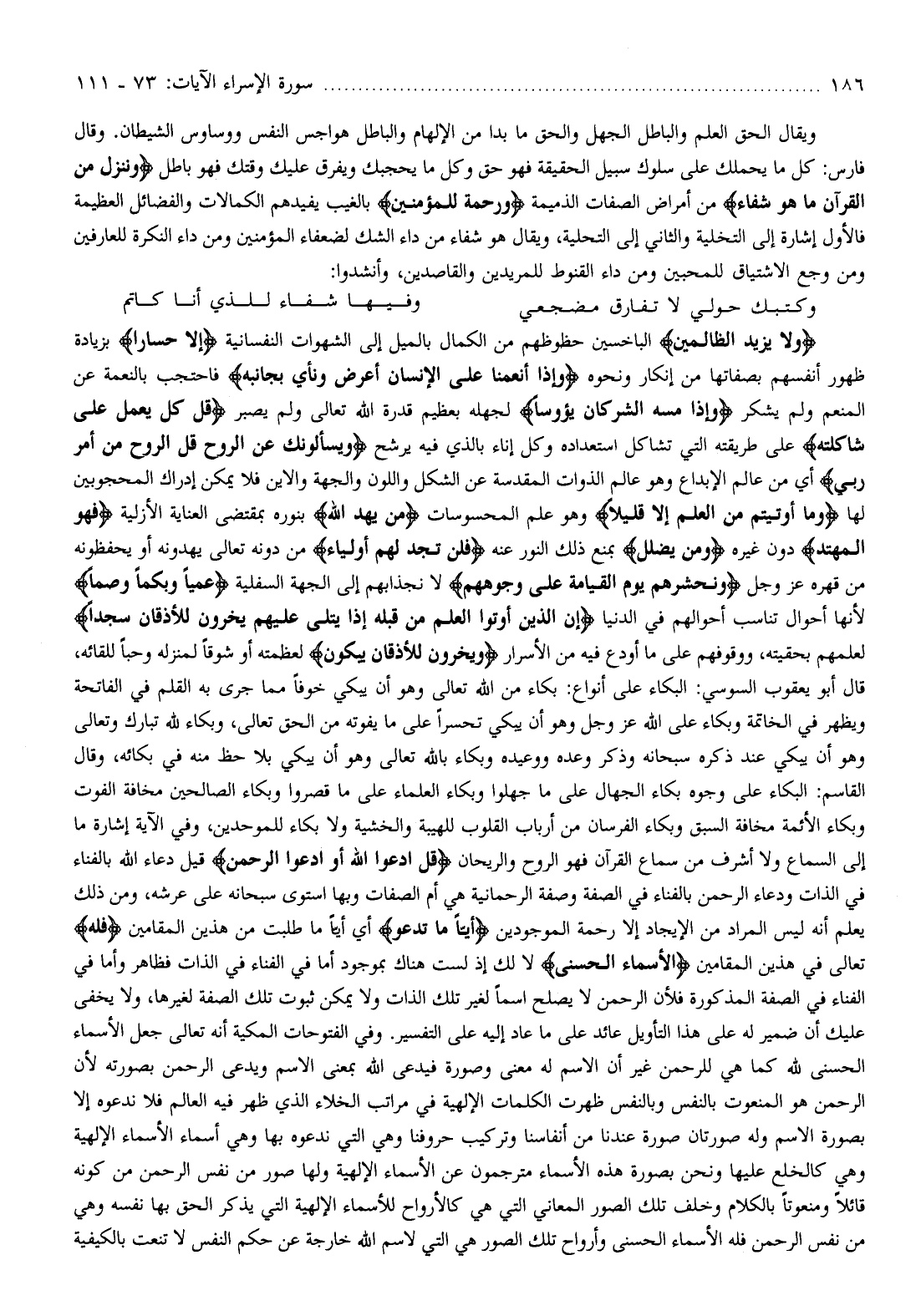 وَلا يَزِيدُ الظَّالِمِينَ الباخسين حظوظهم من الكمال بالميل إلى الشهوات النفسانية إِلَّا خَساراً بزيادة ظهور أنفسهم بصفاتها من إنكار ونحوه وَإِذا أَنْعَمْنا عَلَى الْإِنْسانِ أَعْرَضَ وَنَأى بِجانِبِهِ فاحتجب بالنعمة عن المنعم ولم يشكر وَإِذا مَسَّهُ الشَّرُّ كانَ يَؤُساً لجهله بعظيم قدرة الله تعالى ولم يصبر قُلْ كُلٌّ يَعْمَلُ عَلى شاكِلَتِهِ على طريقته التي تشاكل استعداده وكل إناء بالذي فيه يرشح وَيَسْئَلُونَكَ عَنِ الرُّوحِ قُلِ الرُّوحُ مِنْ أَمْرِ رَبِّي أي من عالم الإبداع وهو عالم الذوات المقدسة عن الشكل واللون والجهة والأين فلا يمكن إدراك المحجوبين لها وَما أُوتِيتُمْ مِنَ الْعِلْمِ إِلَّا قَلِيلًا وهو علم المحسوسات مَنْ يَهْدِ اللَّهُ بنوره بمقتضى العناية الأزلية فَهُوَ الْمُهْتَدِ دون غيره وَمَنْ يُضْلِلْ بمنع ذلك النور عنه فَلَنْ تَجِدَ لَهُمْ أَوْلِياءَ من دونه تعالى يهدونه أو يحفظونه من قهره عز وجل وَنَحْشُرُهُمْ يَوْمَ الْقِيامَةِ عَلى وُجُوهِهِمْ لا نجذابهم إلى الجهة السفلية عُمْياً وَبُكْماً وَصُمًّا لأنها أحوال تناسب أحوالهم في الدنيا إِنَّ الَّذِينَ أُوتُوا الْعِلْمَ مِنْ قَبْلِهِ إِذا يُتْلى عَلَيْهِمْ يَخِرُّونَ لِلْأَذْقانِ سُجَّداً لعلمهم بحقيته، ووقوفهم على ما أودع فيه من الأسرار وَيَخِرُّونَ لِلْأَذْقانِ يَبْكُونَ لعظمته أو شوقا لمنزله وحبا للقائه، قال أبو يعقوب السوسي: البكاء على أنواع: بكاء من الله تعالى وهو أن يبكي خوفا مما جرى به القلم في الفاتحة ويظهر في الخاتمة وبكاء على الله عز وجل وهو أن يبكي تحسرا على ما يفوته من الحق تعالى، وبكاء لله تبارك وتعالى وهو أن يبكي عند ذكره سبحانه وذكر وعده ووعيده وبكاء بالله تعالى وهو أن يبكي بلا حظ منه في بكائه، وقال القاسم: البكاء على وجوه بكاء الجهال على ما جهلوا وبكاء العلماء على ما قصروا وبكاء الصالحين مخافة الفوت وبكاء الأئمة مخافة السبق وبكاء الفرسان من أرباب القلوب للهيبة والخشية ولا بكاء للموحدين، وفي الآية إشارة ما إلى السماع ولا أشرف من سماع القرآن فهو الروح والريحان قُلِ ادْعُوا اللَّهَ أَوِ ادْعُوا الرَّحْمنَ قيل دعاء الله بالفناء في الذات ودعاء الرحمن بالفناء في الصفة وصفة الرحمانية هي أم الصفات وبها استوى سبحانه على عرشه، ومن ذلك يعلم أنه ليس المراد من الإيجاد إلا رحمة الموجودين أَيًّا ما تَدْعُوا أي أيّا ما طلبت من هذين المقامين فَلَهُ تعالى في هذين المقامين الْأَسْماءُ الْحُسْنى لا لك إذ لست هناك بموجود أما في الفناء في الذات فظاهر وأما في الفناء في الصفة المذكورة فلأن الرحمن لا يصلح اسما لغير تلك الذات ولا يمكن ثبوت تلك الصفة لغيرها، ولا يخفى عليك أن ضمير له على هذا التأويل عائد على ما عاد إليه على التفسير. وفي الفتوحات المكية أنه تعالى جعل الأسماء الحسنى لله كما هي للرحمن غير أن الاسم له معنى وصورة فيدعى الله بمعنى الاسم ويدعى الرحمن بصورته لأن الرحمن هو المنعوت بالنفس وبالنفس ظهرت الكلمات الإلهية في مراتب الخلاء الذي ظهر فيه العالم فلا ندعوه إلا بصورة الاسم وله صورتان صورة عندنا من أنفاسنا وتركيب حروفنا وهي التي ندعوه بها وهي أسماء الأسماء الإلهية وهي كالخلع عليها ونحن بصورة هذه الأسماء مترجمون عن الأسماء الإلهية ولها صور من نفس الرحمن من كونه قائلا ومنعوتا بالكلام وخلف تلك الصور المعاني التي هي كالأرواح للأسماء الإلهية التي يذكر الحق بها نفسه وهي من نفس الرحمن فله الأسماء الحسنى وأرواح تلك الصور هي التي لاسم الله خارجة عن حكم النفس لا تنعت بالكيفية