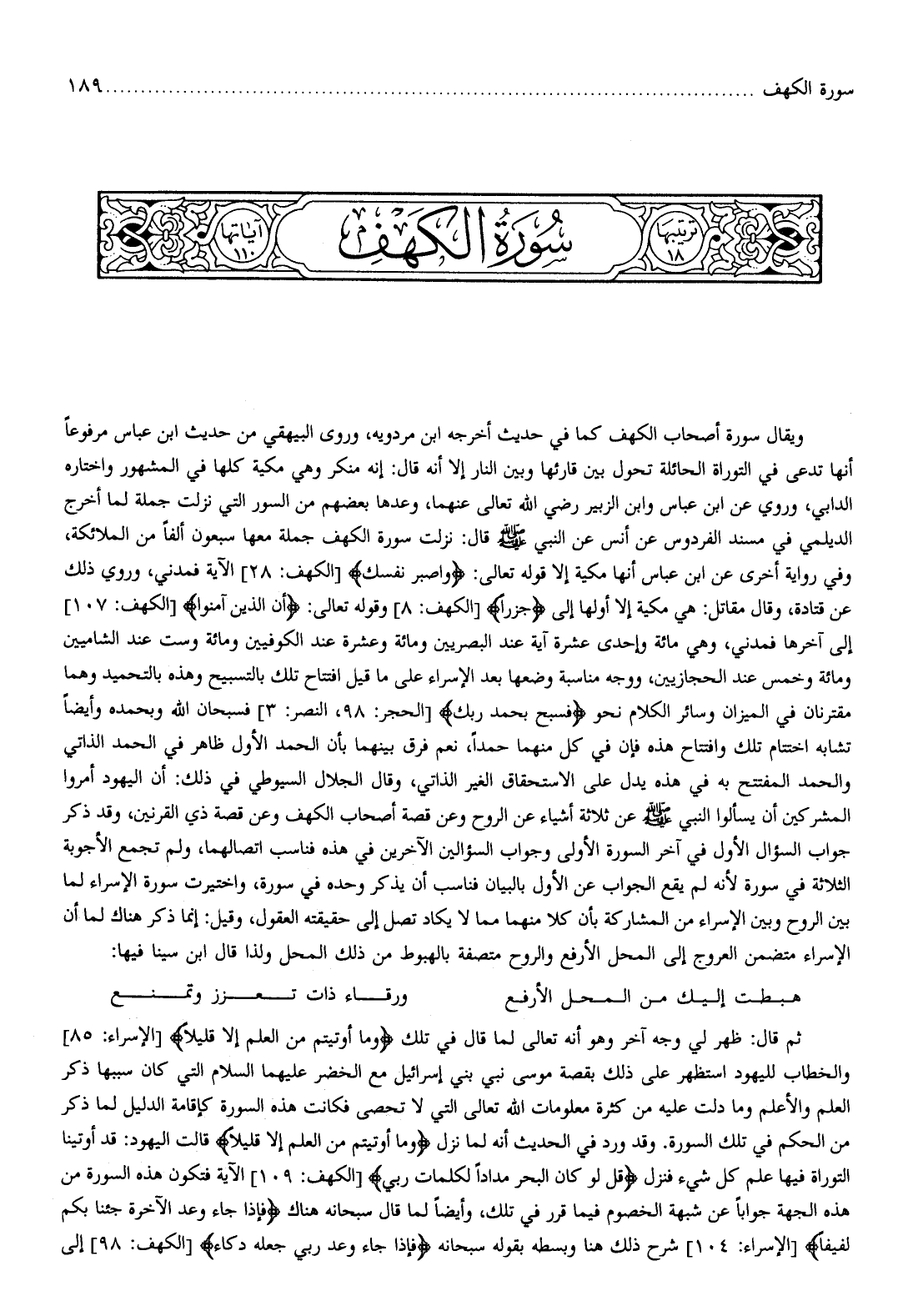وفي رواية أخرى عن ابن عباس أنها مكية إلا قوله تعالى: وَاصْبِرْ نَفْسَكَ [الكهف: 28] الآية فمدني، وروي ذلك عن قتادة، وقال مقاتل: هي مكية إلا أولها إلى جُرُزاً [الكهف: 8] وقوله تعالى: إِنَّ الَّذِينَ آمَنُوا [الكهف: 107] إلى آخرها فمدني، وهي مائة وإحدى عشرة آية عند البصريين ومائة وعشرة عند الكوفيين ومائة وست عند الشاميين ومائة وخمس عند الحجازيين، ووجه مناسبة وضعها بعد الإسراء على ما قيل افتتاح تلك بالتسبيح وهذه بالتحميد وهما مقترنان في الميزان وسائر الكلام نحو فَسَبِّحْ بِحَمْدِ رَبِّكَ [الحجر: 98، النصر: 3] فسبحان الله وبحمده وأيضا تشابه اختتام تلك وافتتاح هذه فإن في كل منهما حمدا، نعم فرق بينهما بأن الحمد الأول ظاهر في الحمد الذاتي والحمد المفتتح به في هذه يدل على الاستحقاق الغير الذاتي، وقال الجلال السيوطي في ذلك: أن اليهود أمروا المشركين أن يسألوا النبي صلّى الله عليه وسلّم عن ثلاثة أشياء عن الروح وعن قصة أصحاب الكهف وعن قصة ذي القرنين، وقد ذكر جواب السؤال الأول في آخر السورة الأولى وجواب السؤالين الآخرين في هذه فناسب اتصالهما، ولم تجمع الأجوبة الثلاثة في سورة لأنه لم يقع الجواب عن الأول بالبيان فناسب أن يذكر وحده في سورة، واختيرت سورة الإسراء لما بين الروح وبين الإسراء من المشاركة بأن كلا منهما مما لا يكاد تصل إلى حقيقته العقول، وقيل: إنما ذكر هناك لما أن الإسراء متضمن العروج إلى المحل الأرفع والروح متصفة بالهبوط من ذلك المحل ولذا قال ابن سينا فيها: