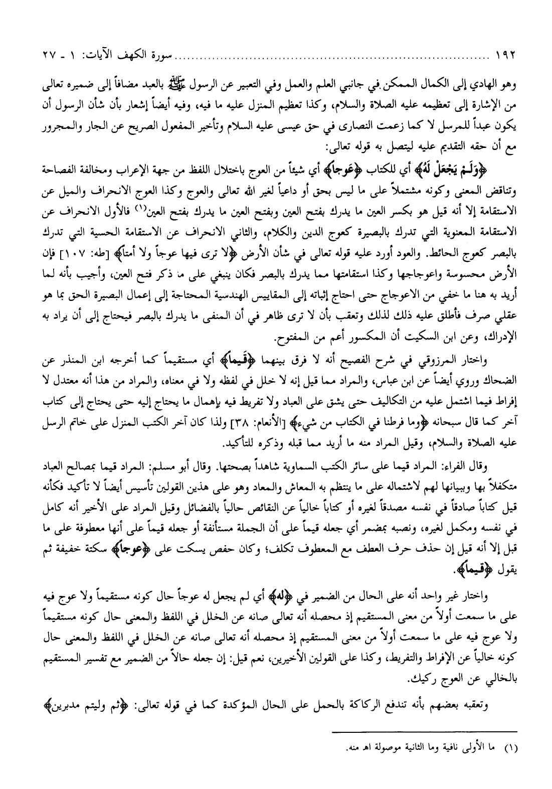 وقال الفراء: المراد قيما على سائر الكتب السماوية شاهدا بصحتها. وقال أبو مسلم: المراد قيما بمصالح العباد متكفلا بها وببيانها لهم لاشتماله على ما ينتظم به المعاش والمعاد وهو على هذين القولين تأسيس أيضا لا تأكيد فكأنه قيل كتابا صادقا في نفسه مصدقا لغيره أو كتابا خاليا عن النقائص حاليا بالفضائل وقيل المراد على الأخير أنه كامل في نفسه ومكمل لغيره، ونصبه بمضمر أي جعله قيما على أن الجملة مستأنفة أو جعله قيما على أنها معطوفة على ما قبل إلا أنه قيل إن حذف حرف العطف مع المعطوف تكلف وكان حفص يسكت على عِوَجاً سكتة خفيفة ثم يقول قَيِّماً.