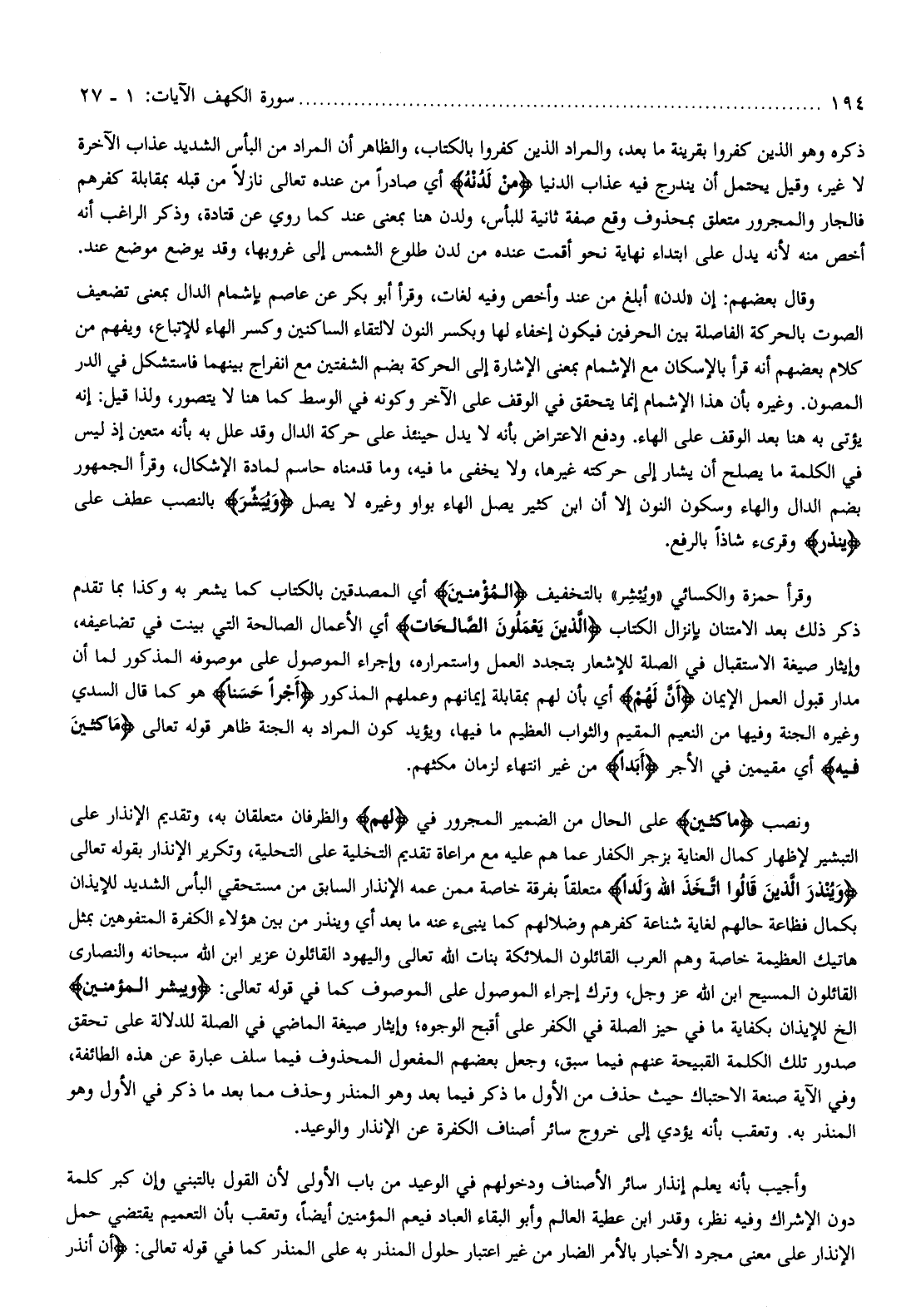 ونصب ماكِثِينَ على الحال من الضمير المجرور في لَهُمْ والظرفان متعلقان به، وتقديم الإنذار على التبشير لإظهار كمال العناية بزجر الكفار عما هم عليه مع مراعاة تقديم التخلية على التحلية، وتكرير الإنذار بقوله تعالى وَيُنْذِرَ الَّذِينَ قالُوا اتَّخَذَ اللَّهُ وَلَداً متعلقا بفرقة خاصة ممن عمه الإنذار السابق من مستحقي البأس الشديد للإيذان بكمال فظاعة حالهم لغاية شناعة كفرهم وضلالهم كما ينبىء عنه ما بعد أي وينذر من بين هؤلاء الكفرة المتفوهين بمثل هاتيك العظيمة خاصة وهم العرب القائلون الملائكة بنات الله تعالى واليهود القائلون عزير ابن الله سبحانه والنصارى القائلون المسيح ابن الله عز وجل، وترك إجراء الموصول على الموصوف كما في قوله تعالى: وَيُبَشِّرَ الْمُؤْمِنِينَ إلخ للإيذان بكفاية ما في حيز الصلة في الكفر على أقبح الوجوه وإيثار صيغة الماضي في الصلة للدلالة على تحقق صدور تلك الكلمة القبيحة عنهم فيما سبق، وجعل بعضهم المفعول المحذوف فيما سلف عبارة عن هذه الطائفة، وفي الآية صنعة الاحتباك حيث حذف من الأول ما ذكر فيما بعد وهو المنذر وحذف مما بعد ما ذكر في الأول وهو المنذر به. وتعقب بأنه يؤدي إلى خروج سائر أصناف الكفرة عن الإنذار والوعيد.