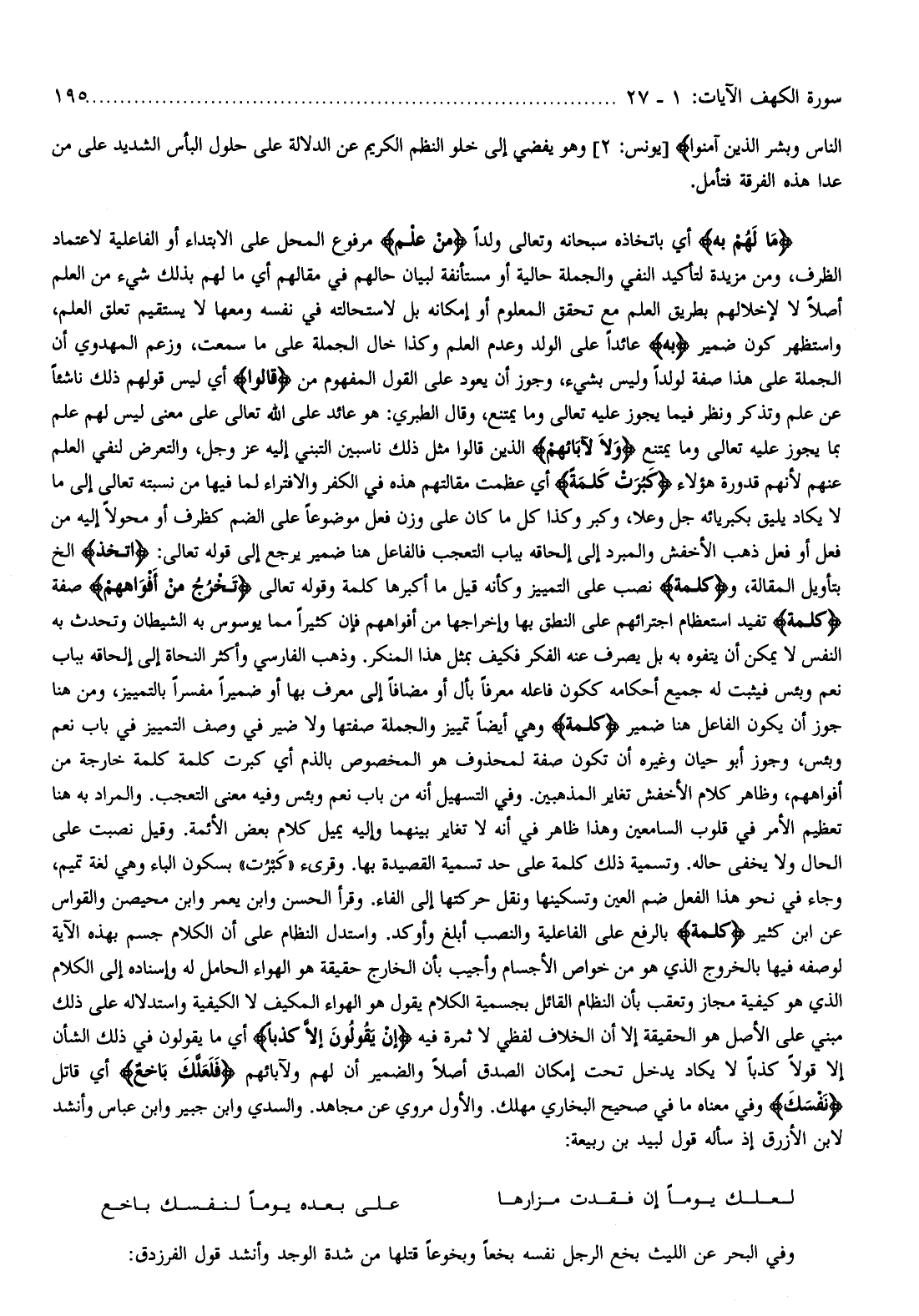 ما لَهُمْ بِهِ أي باتخاذه سبحانه وتعالى ولدا مِنْ عِلْمٍ مرفوع المحل على الابتداء أو الفاعلية لاعتماد الظرف، ومن مزيدة لتأكيد النفي والجملة حالية أو مستأنفة لبيان حالهم في مقالهم أي ما لهم بذلك شيء من العلم أصلا لا لإخلالهم بطريق العلم مع تحقق المعلوم أو إمكانه بل لا ستحالته في نفسه ومعها لا يستقيم تعلق العلم، واستظهر كون ضمير بِهِ عائدا على الولد وعدم العلم وكذا خال الجملة على ما سمعت، وزعم المهدوي أن الجملة على هذا صفة لولدا وليس بشيء، وجوز أن يعود على القول المفهوم من قالُوا أي ليس قولهم ذلك ناشئا عن علم وتذكر ونظر فيما يجوز عليه تعالى وما يمتنع، وقال الطبري: هو عائد على الله تعالى على معنى ليس لهم علم بما يجوز عليه تعالى وما يمتنع وَلا لِآبائِهِمْ الذين قالوا مثل ذلك ناسبين التبني إليه عز وجل، والتعرض لنفي العلم عنهم لأنهم قدورة هؤلاء كَبُرَتْ كَلِمَةً أي عظمت مقالتهم هذه في الكفر والافتراء لما فيها من نسبته تعالى إلى ما لا يكاد يليق بكبريائه جل وعلا، وكبر وكذا كل ما كان على وزن فعل موضوعا على الضم كظرف أو محولا إليه من فعل أو فعل ذهب الأخفش والمبرد إلى إلحاقه بباب التعجب فالفاعل هنا ضمير يرجع إلى قوله تعالى: اتَّخَذَ إلخ بتأويل المقالة، وكَلِمَةً نصب على التمييز وكأنه قيل ما أكبرها كلمة وقوله تعالى تَخْرُجُ مِنْ أَفْواهِهِمْ صفة كَلِمَةً تفيد استعظام اجترائهم على النطق بها وإخراجها من أفواههم فإن كثيرا مما يوسوس به الشيطان وتحدث به النفس لا يمكن أن يتفوه به بل يصرف عنه الفكر فكيف بمثل هذا المنكر. وذهب الفارسي وأكثر النحاة إلى إلحاقه بباب نعم وبئس فيثبت له جميع أحكامه ككون فاعله معرفا بأل أو مضافا إلى معرف بها أو ضميرا مفسرا بالتمييز، ومن هنا جوز أن يكون الفاعل هنا ضمير كَلِمَةً وهي أيضا تمييز والجملة صفتها ولا ضير في وصف التمييز في باب نعم وبئس، وجوز أبو حيان وغيره أن تكون صفة لمحذوف هو المخصوص بالذم أي كبرت كلمة كلمة خارجة من أفواههم، وظاهر كلام الأخفش تغاير المذهبين. وفي التسهيل أنه من باب نعم وبئس وفيه معنى التعجب. والمراد به هنا تعظيم الأمر في قلوب السامعين وهذا ظاهر في أنه لا تغاير بينهما وإليه يميل كلام بعض الأئمة. وقيل نصبت على الحال ولا يخفى حاله. وتسمية ذلك كلمة على حد تسمية القصيدة بها. وقرىء «كبرت» بسكون الباء وهي لغة تميم، وجاء في نحو هذا الفعل ضم العين وتسكينها ونقل حركتها إلى الفاء. وقرأ الحسن وابن يعمر وابن محيصن والقواس عن ابن كثير كلمة بالرفع على الفاعلية والنصب أبلغ وأوكد. واستدل النظام على أن الكلام جسم بهذه الآية لوصفه فيها بالخروج الذي هو من خواص الأجسام وأجيب بأن الخارج حقيقة هو الهواء الحامل له وإسناده إلى الكلام الذي هو كيفية مجاز وتعقب بأن النظام القائل بجسمية الكلام يقول هو الهواء المكيف لا الكيفية واستدلاله على ذلك مبني على الأصل هو الحقيقة إلا أن الخلاف لفظي لا ثمرة فيه إِنْ يَقُولُونَ إِلَّا كَذِباً أي ما يقولون في ذلك الشأن إلا قولا كذبا لا يكاد يدخل تحت إمكان الصدق أصلا والضمير أن لهم ولآبائهم فَلَعَلَّكَ باخِعٌ أي قاتل نَفْسَكَ وفي معناه ما في صحيح البخاري مهلك. والأول مروي عن مجاهد. والسدي وابن جبير وابن عباس وأنشد لابن الأزرق إذ سأله قول لبيد بن ربيعة: