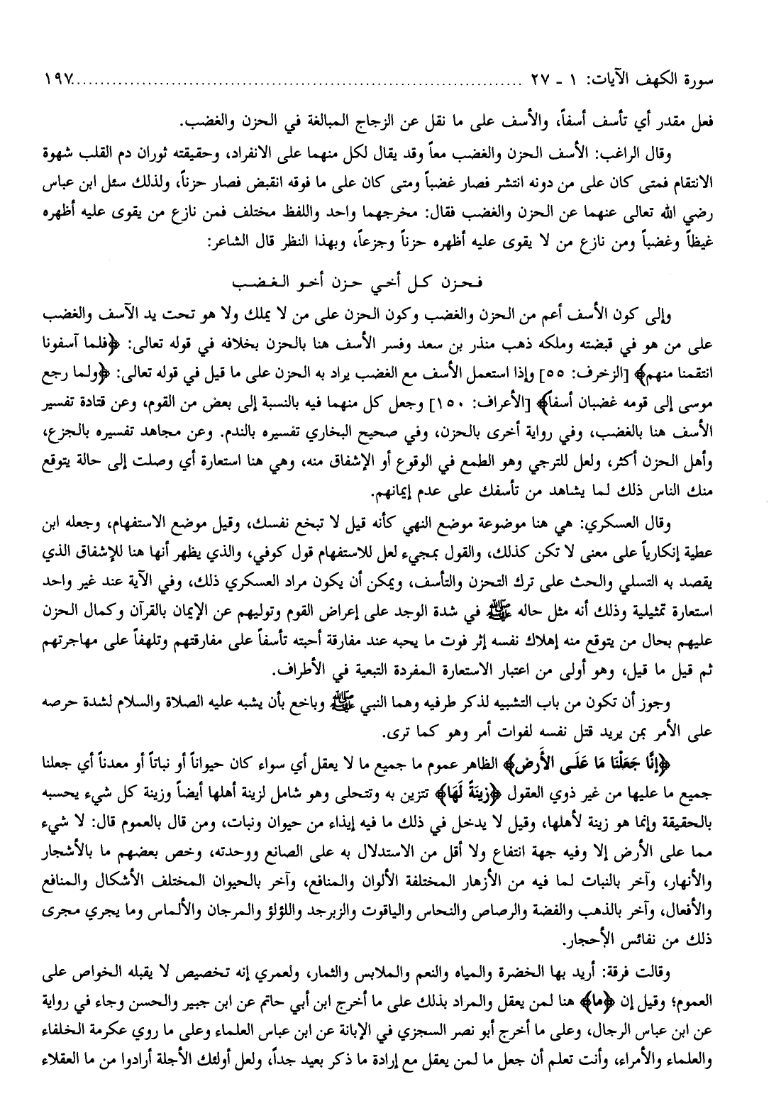 فحزن كل أخي حزن أخو الغضب وإلى كون الأسف أعم من الحزن والغضب وكون الحزن على من لا يملك ولا هو تحت يد الآسف والغضب على من هو في قبضته وملكه ذهب منذر بن سعد وفسر الأسف هنا بالحزن بخلافه في قوله تعالى: فَلَمَّا آسَفُونا انْتَقَمْنا مِنْهُمْ [الزخرف: 55] وإذا استعمل الأسف مع الغضب يراد به الحزن على ما قيل في قوله تعالى: وَلَمَّا رَجَعَ مُوسى إِلى قَوْمِهِ غَضْبانَ أَسِفاً [الأعراف: 150] وجعل كل منهما فيه بالنسبة إلى بعض من القوم، وعن قتادة تفسير الأسف هنا بالغضب، وفي رواية أخرى بالحزن، وفي صحيح البخاري تفسيره بالندم. وعن مجاهد تفسيره بالجزع، وأهل الحزن أكثر، ولعل للترجي وهو الطمع في الوقوع أو الإشفاق منه، وهي هنا استعارة أي وصلت إلى حالة يتوقع منك الناس ذلك لما يشاهد من تأسفك على عدم إيمانهم.