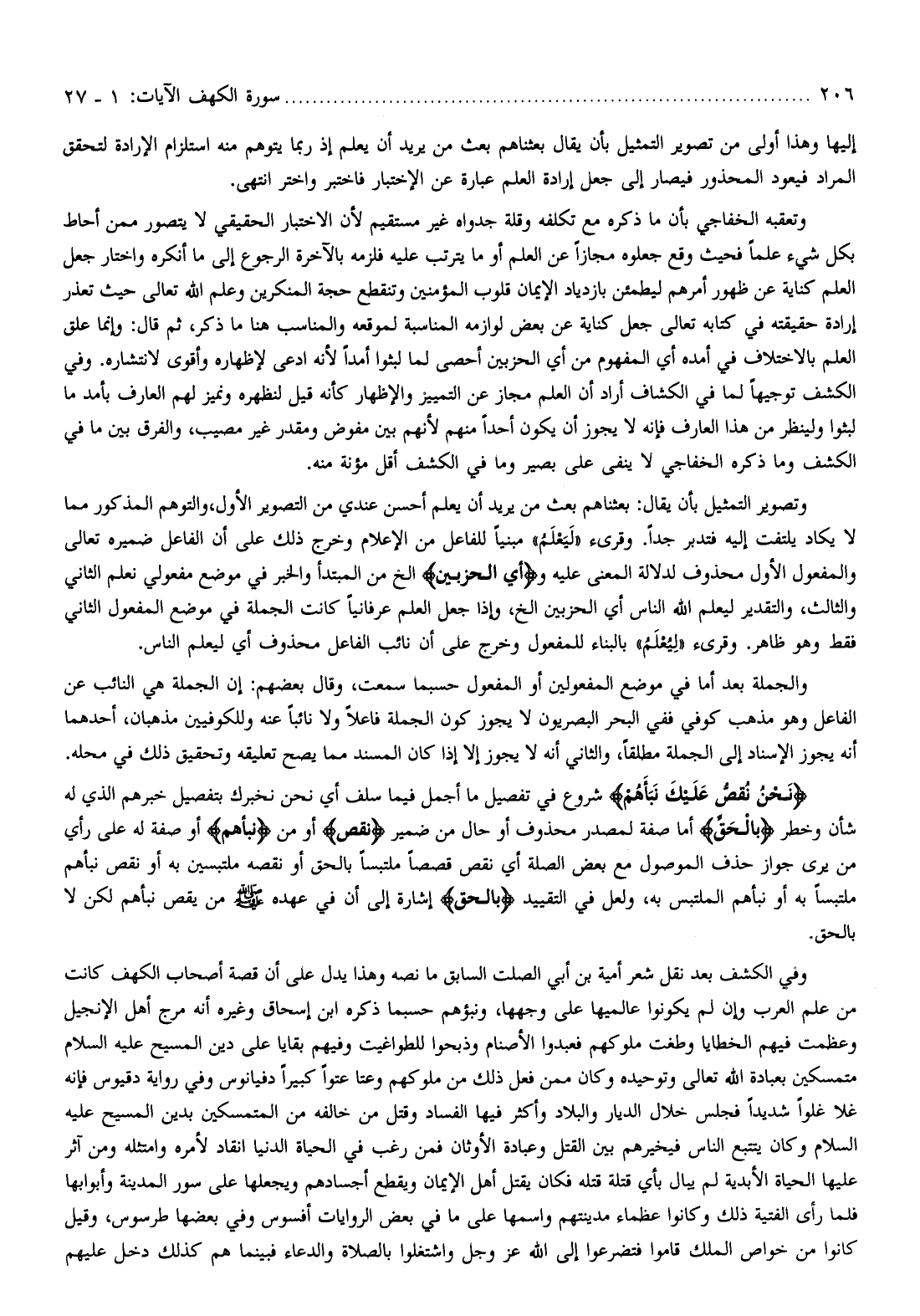 وتعقبه الخفاجي بأن ما ذكره مع تكلفه وقلة جدواه غير مستقيم لأن الاختيار الحقيقي لا يتصور ممن أحاط بكل شيء علما فحيث وقع جعلوه مجازا عن العلم أو ما يترتب عليه فلزمه بالآخرة الرجوع إلى ما أنكره واختار جعل العلم كناية عن ظهور أمرهم ليطمئن بازدياد الإيمان قلوب المؤمنين وتنقطع حجة المنكرين وعلم الله تعالى حيث تعذر إرادة حقيقته في كتابه تعالى جعل كناية عن بعض لوازمه المناسبة لموقعه والمناسب هنا ما ذكر، ثم قال: وإنما علق العلم بالاختلاف في أمده أي المفهوم من أي الحزبين أحصى لما لبثوا أمدا لأنه ادعى لإظهاره وأقوى لانتشاره. وفي الكشف توجيها لما في الكشاف أراد أن العلم مجاز عن التمييز والإظهار كأنه قيل لنظهره ونميز لهم العارف بأمد ما لبثوا ولينظر من هذا العارف فإنه لا يجوز أن يكون أحدا منهم لأنهم بين مفوض ومقدر غير مصيب، والفرق بين ما في الكشف وما ذكره الخفاجي لا ينفى على بصير وما في الكشف أقل مؤنة منه.