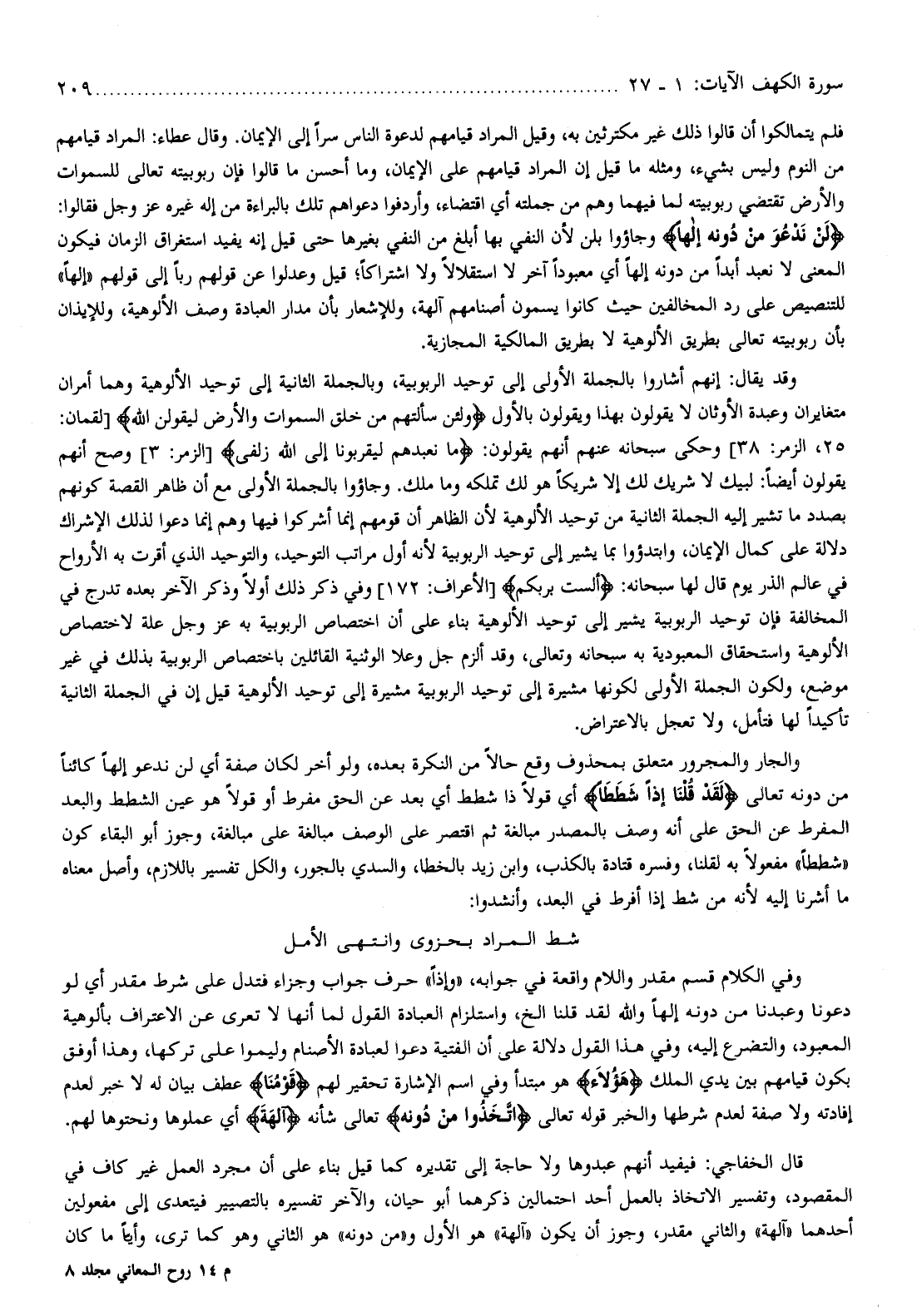 شط المراد بحزوى وانتهى الأمل وفي الكلام قسم مقدر واللام واقعة في جوابه، «وإذا» حرف جواب وجزاء فتدل على شرط مقدر أي لو دعونا وعبدنا من دونه إلها والله لقد قلنا إلخ، واستلزام العبادة القول لما أنها لا تعرى عن الاعتراف بألوهية المعبود، والتضرع إليه، وفي هذا القول دلالة على أن الفتية دعوا لعبادة الأصنام وليموا على تركها، وهذا أوفق بكون قيامهم بين يدي الملك هؤُلاءِ هو مبتدأ وفي اسم الإشارة تحقير لهم قَوْمُنَا عطف بيان له لا خبر لعدم إفادته ولا صفة لعدم شرطها والخبر قوله تعالى اتَّخَذُوا مِنْ دُونِهِ تعالى شأنه آلِهَةً أي عملوها ونحتوها لهم.