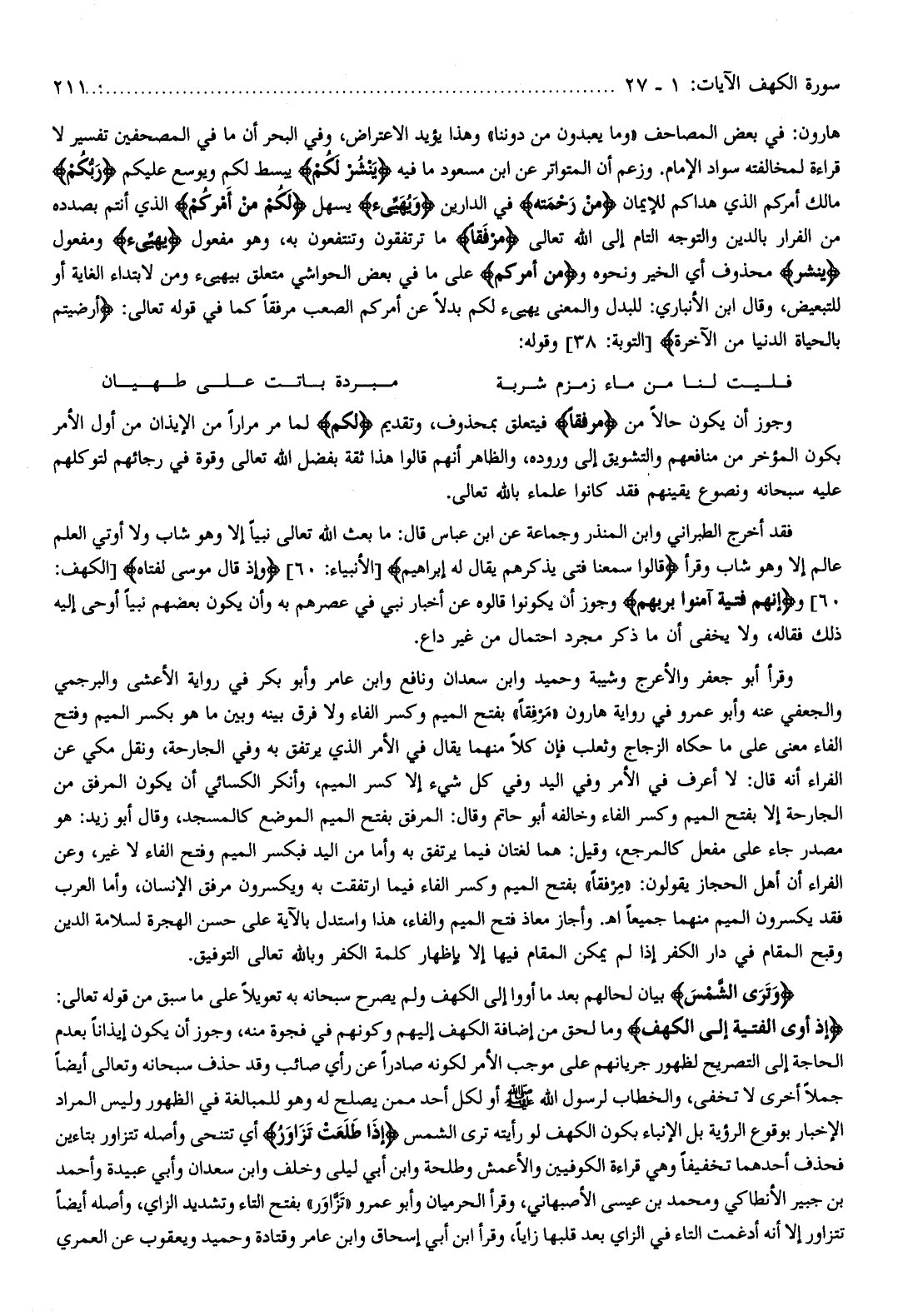 هارون: في بعض المصاحف «وما يعبدون من دوننا» وهذا يؤيد الاعتراض، وفي البحر أن ما في المصحفين تفسير لا قراءة لمخالفته سواد الإمام. وزعم أن المتواتر عن ابن مسعود ما فيه يَنْشُرْ لَكُمْ يبسط لكم ويوسع عليكم رَبُّكُمْ مالك أمركم الذي هداكم للإيمان مِنْ رَحْمَتِهِ في الدارين وَيُهَيِّئْ يسهل لَكُمْ مِنْ أَمْرِكُمْ الذي أنتم بصدده من الفرار بالدين والتوجه التام إلى الله تعالى مِرفَقاً ما ترتفقون وتنتفعون به، وهو مفعول يُهَيِّئْ ومفعول يَنْشُرْ محذوف أي الخير ونحوه مِنْ أَمْرِكُمْ على ما في بعض الحواشي متعلق بيهيىء ومن لابتداء الغاية أو للتبعيض، وقال ابن الأنباري: للبدل والمعنى يهيىء لكم بدلا عن أمركم الصعب مرفقا كما في قوله تعالى: أَرَضِيتُمْ بِالْحَياةِ الدُّنْيا مِنَ الْآخِرَةِ [التوبة: 38] وقوله: