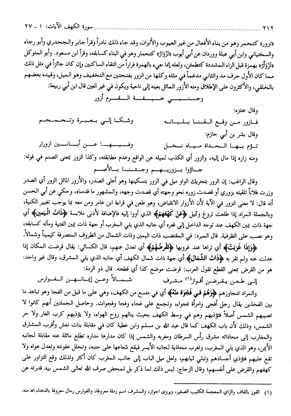 جاؤوا بزوريهم وجئنا بالأصم وقال الراغب: إن الزور بتحريك الواو ميل في الزور بتسكينها وهو أعلى الصدر، والأزور المائل الزور أي الصدر وزرت فلانا تلقيته بزوري أو قصدت زوره نحو وجهته أي قصدت وجهه، والمشهور ما قدمناه، وحكي عن أبي الحسن أنه قال: لا معنى لتزور في الآية لأن الازورار الانقباض، وهو طعن في قراءة ابن عامر ومن معه بما يوجب تغيير الكنية، وبالجملة المراد إذا طلعت تروغ وتميل عَنْ كَهْفِهِمْ الذي آووا إليه فالإضافة لأدنى ملابسة ذاتَ الْيَمِينِ أي جهة ذات يمين الكهف عند توجه الداخل إلى قعره أي جانبه الذي يلي المغرب أو جهة ذات يمين الفتية ومآله كسابقه، وهو نصب على الظرفية. قال المبرد: في المقتضب ذات اليمين وذات الشمال من الظروف المتصرفة كيمينا وشمالا.