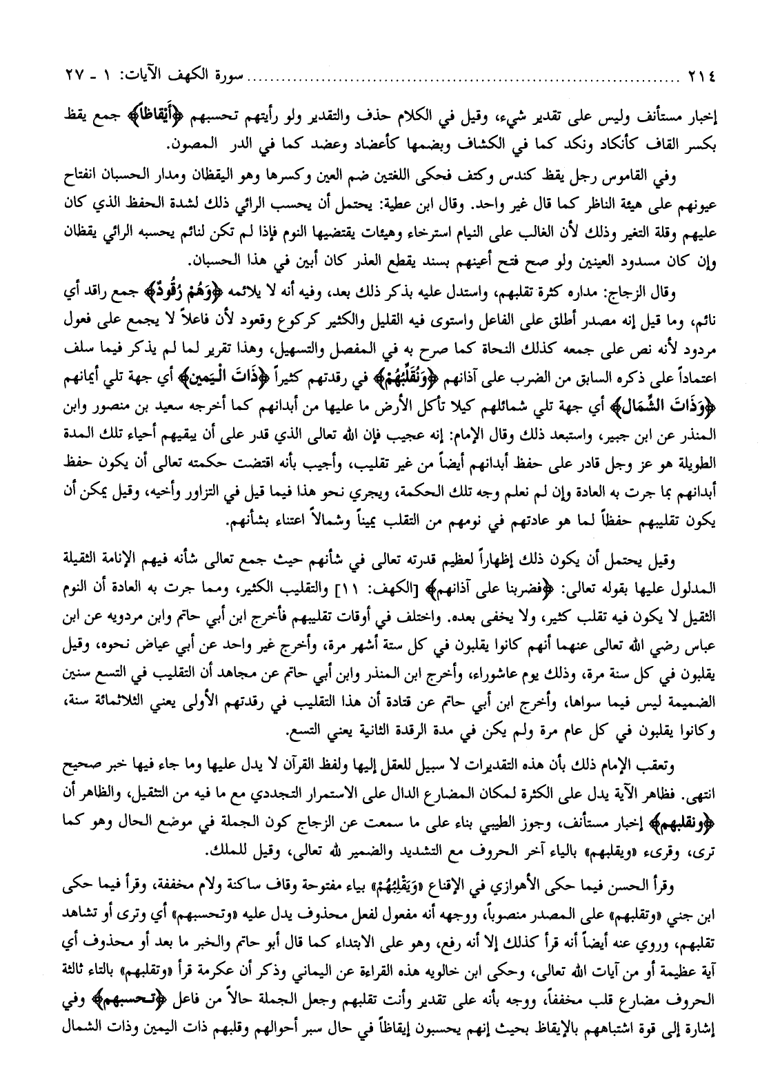 وقال الزجاج: مداره كثرة تقلبهم، واستدل عليه بذكر ذلك بعد، وفيه أنه لا يلائمه وَهُمْ رُقُودٌ جمع راقد أي نائم، وما قيل إنه مصدر أطلق على الفاعل واستوى فيه القليل والكثير كركوع وقعود لأن فاعلا لا يجمع على فعول مردود لأنه نص على جمعه كذلك النحاة كما صرح به في المفصل والتسهيل، وهذا تقرير لما لم يذكر فيما سلف اعتمادا على ذكره السابق من الضرب على آذانهم وَنُقَلِّبُهُمْ في رقدتهم كثيرا ذاتَ الْيَمِينِ أي جهة تلي أيمانهم وَذاتَ الشِّمالِ أي جهة تلي شمائلهم كيلا تأكل الأرض ما عليها من أبدانهم كما أخرجه سعيد بن منصور وابن المنذر عن ابن جبير، واستبعد ذلك وقال الإمام: إنه عجيب فإن الله تعالى الذي قدر على أن يبقيهم أحياء تلك المدة الطويلة هو عز وجل قادر على حفظ أبدانهم أيضا من غير تقليب، وأجيب بأنه اقتضت حكمته تعالى أن يكون حفظ أبدانهم بما جرت به العادة وإن لم نعلم وجه تلك الحكمة، ويجري نحو هذا فيما قيل في التزاور وأخيه، وقيل يمكن أن يكون تقليبهم حفظا لما هو عادتهم في نومهم من التقلب يمينا وشمالا اعتناء بشأنهم.