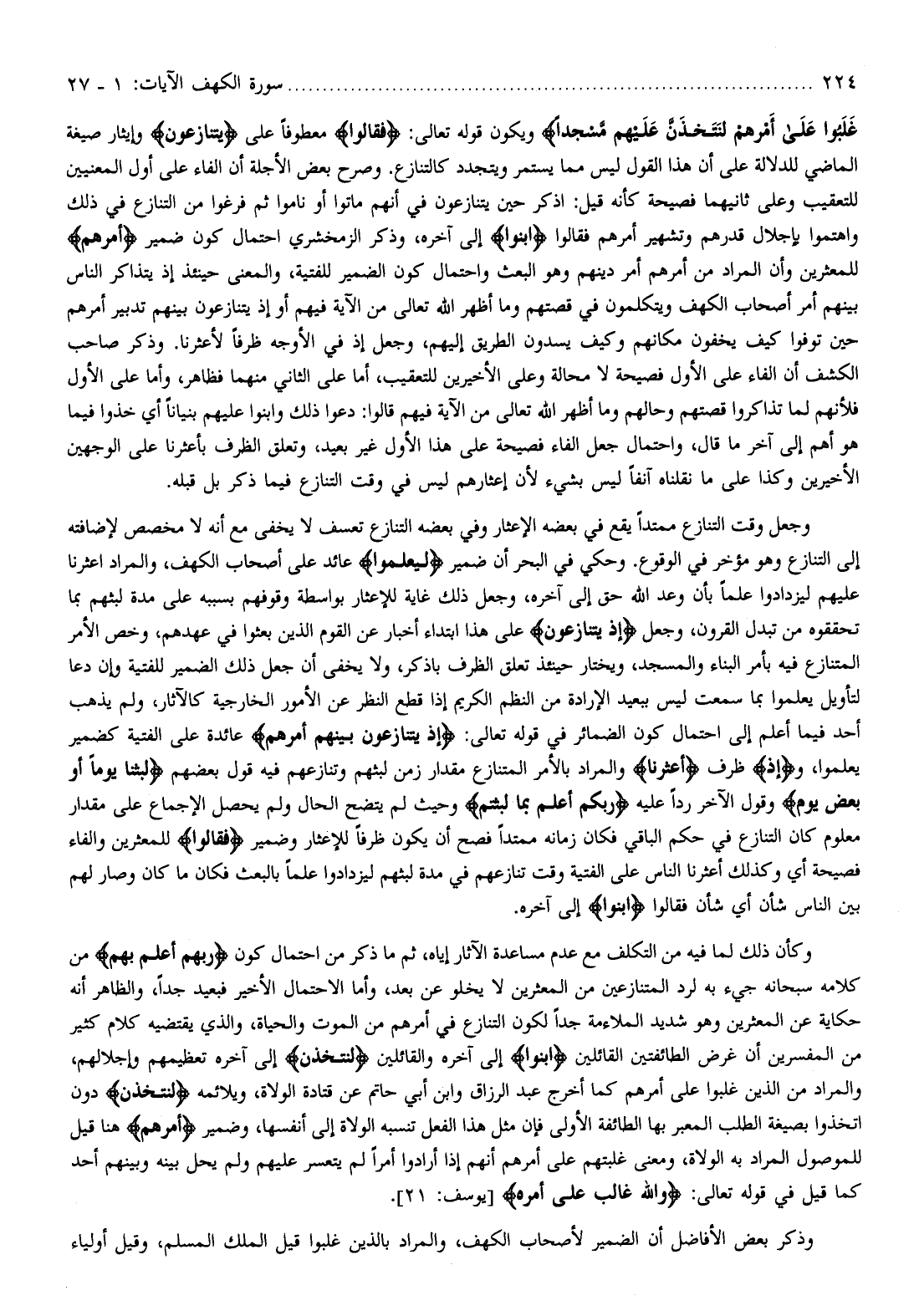 وكأن ذلك لما فيه من التكلف مع عدم مساعدة الآثار إياه، ثم ما ذكر من احتمال كون رَبُّهُمْ أَعْلَمُ بِهِمْ من كلامه سبحانه جيء به لرد المتنازعين من المعثرين لا يخلو عن بعد، وأما الاحتمال الأخير فبعيد جدا، والظاهر أنه حكاية عن المعثرين وهو شديد الملاءمة جدا لكون التنازع في أمرهم من الموت والحياة، والذي يقتضيه كلام كثير من المفسرين أن غرض الطائفتين القائلين ابْنُوا إلى آخره والقائلين لَنَتَّخِذَنَّ إلى آخره تعظيمهم وإجلالهم، والمراد من الذين غلبوا على أمرهم كما أخرج عبد الرزاق وابن أبي حاتم عن قتادة الولاة، ويلائمه لَنَتَّخِذَنَّ دون اتخذوا بصيغة الطلب المعبر بها الطائفة الأولى فإن مثل هذا الفعل تنسبه الولاة إلى أنفسها، وضمير أَمْرَهُمْ هنا قيل للموصول المراد به الولاة، ومعنى غلبتهم على أمرهم أنهم إذا أرادوا أمرا لم يتعسر عليهم ولم يحل بينه وبينهم أحد كما قيل في قوله تعالى: وَاللَّهُ غالِبٌ عَلى أَمْرِهِ [يوسف: 21] .