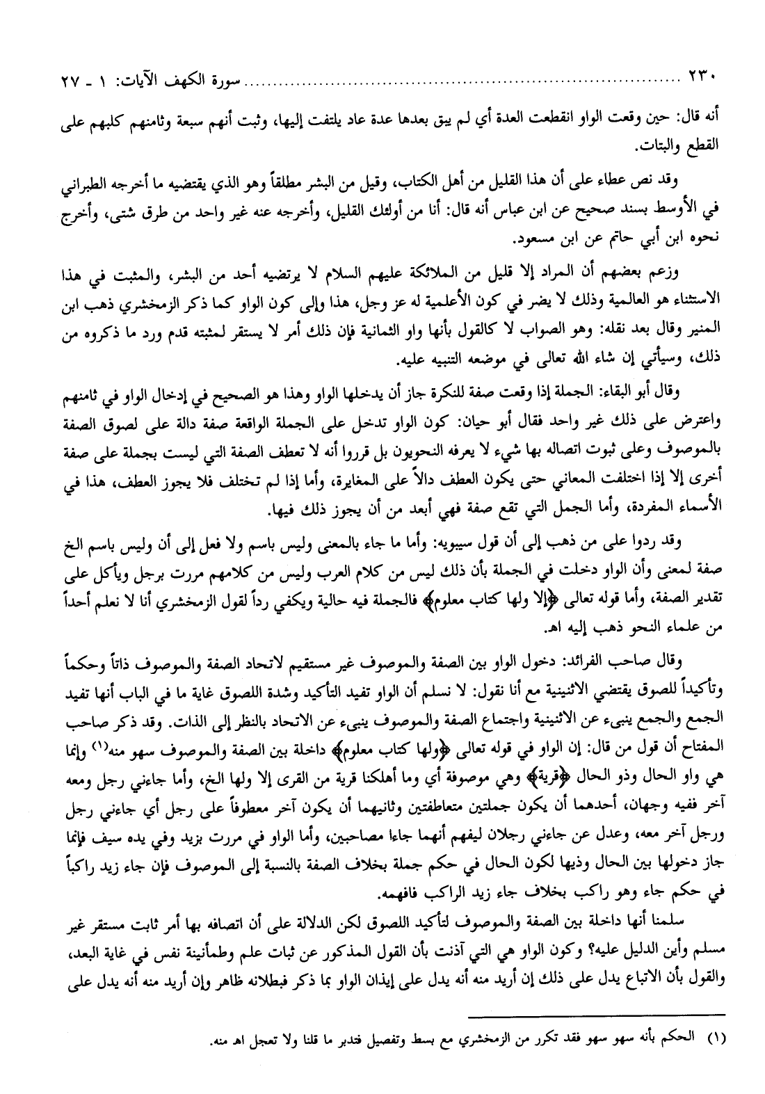 وقال أبو البقاء: الجملة إذا وقعت صفة للنكرة جاز أن يدخلها الواو وهذا هو الصحيح في إدخال الواو في ثامنهم واعترض على ذلك غير واحد فقال أبو حيان: كون الواو تدخل على الجملة الواقعة صفة دالة على لصوق الصفة بالموصوف وعلى ثبوت اتصاله بها شيء لا يعرفه النحويون بل قرروا أنه لا تعطف الصفة التي ليست بجملة على صفة أخرى إلا إذا اختلفت المعاني حتى يكون العطف دالا على المغايرة، وأما إذا لم تختلف فلا يجوز العطف، هذا في الأسماء المفردة، وأما الجمل التي تقع صفة فهي أبعد من أن يجوز ذلك فيها.