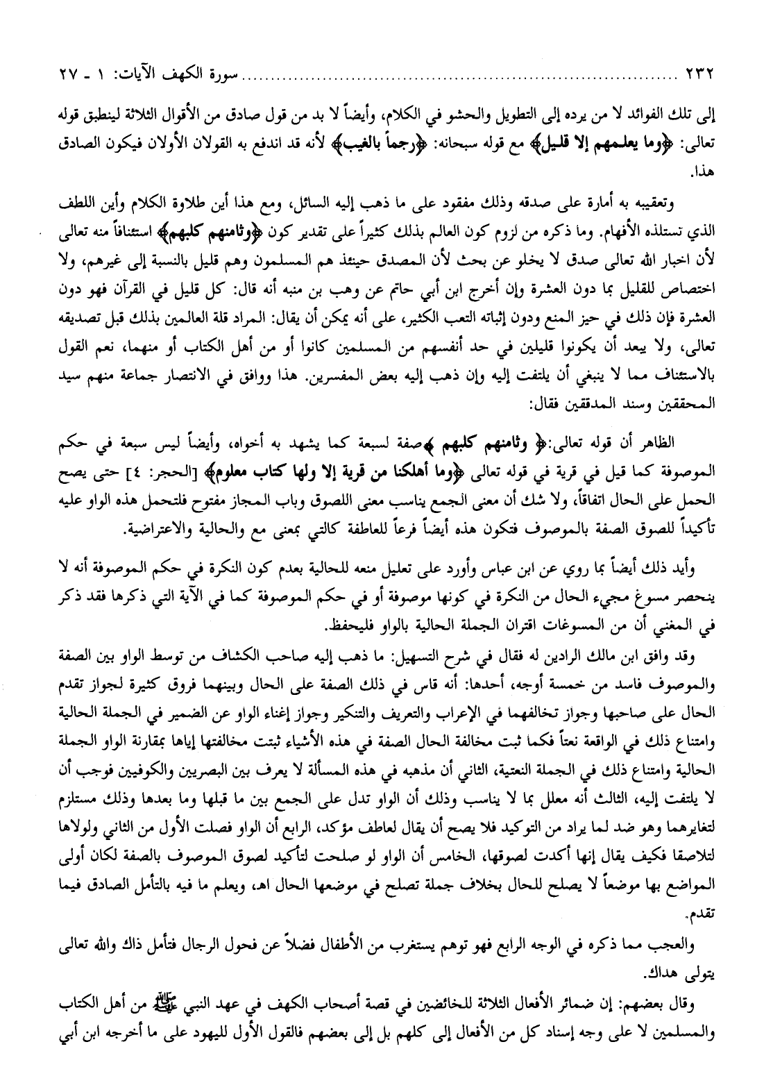 إلى تلك الفوائد لا من يرده إلى التطويل والحشو في الكلام، وأيضا لا بد من قول صادق من الأقوال الثلاثة لينطبق قوله تعالى: ما يَعْلَمُهُمْ إِلَّا قَلِيلٌ مع قوله سبحانه: رَجْماً بِالْغَيْبِ لأنه قد اندفع به القولان الأولان فيكون الصادق هذا.