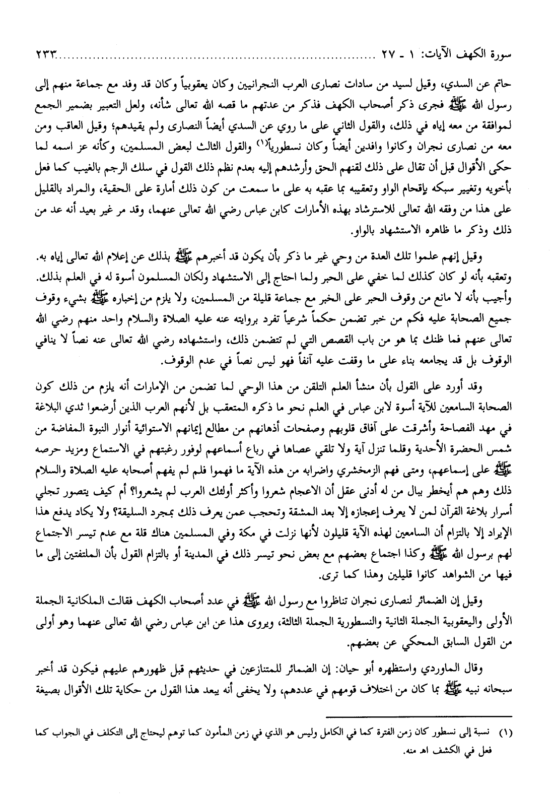 وقيل إن الضمائر لنصارى نجران تناظروا مع رسول الله صلّى الله عليه وسلّم في عدد أصحاب الكهف فقالت الملكانية الجملة الأولى واليعقوبية الجملة الثانية والنسطورية الجملة الثالثة، ويروى هذا عن ابن عباس رضي الله تعالى عنهما وهو أولى من القول السابق المحكي عن بعضهم.