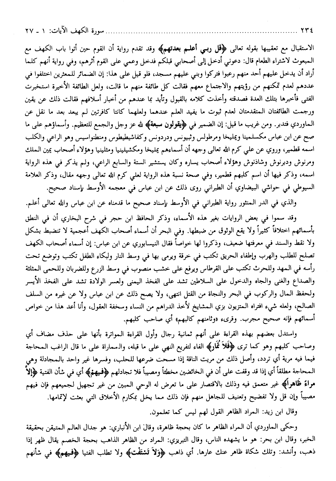 وحكى الماوردي أن المراء الظاهر ما كان بحجة ظاهرة، وقال ابن الأنباري: هو جدال العالم المتيقن بحقيقة الخبر، وقال ابن بحر: هو ما يشهده الناس، وقال التبريزي: المراد من الظاهر الذاهب بحجة الخصم يقال ظهر إذا ذهب، وأنشد: وتلك شكاة ظاهر عنك عارها. أي ذاهب وَلا تَسْتَفْتِ ولا تطلب الفتيا فِيهِمْ في شأنهم