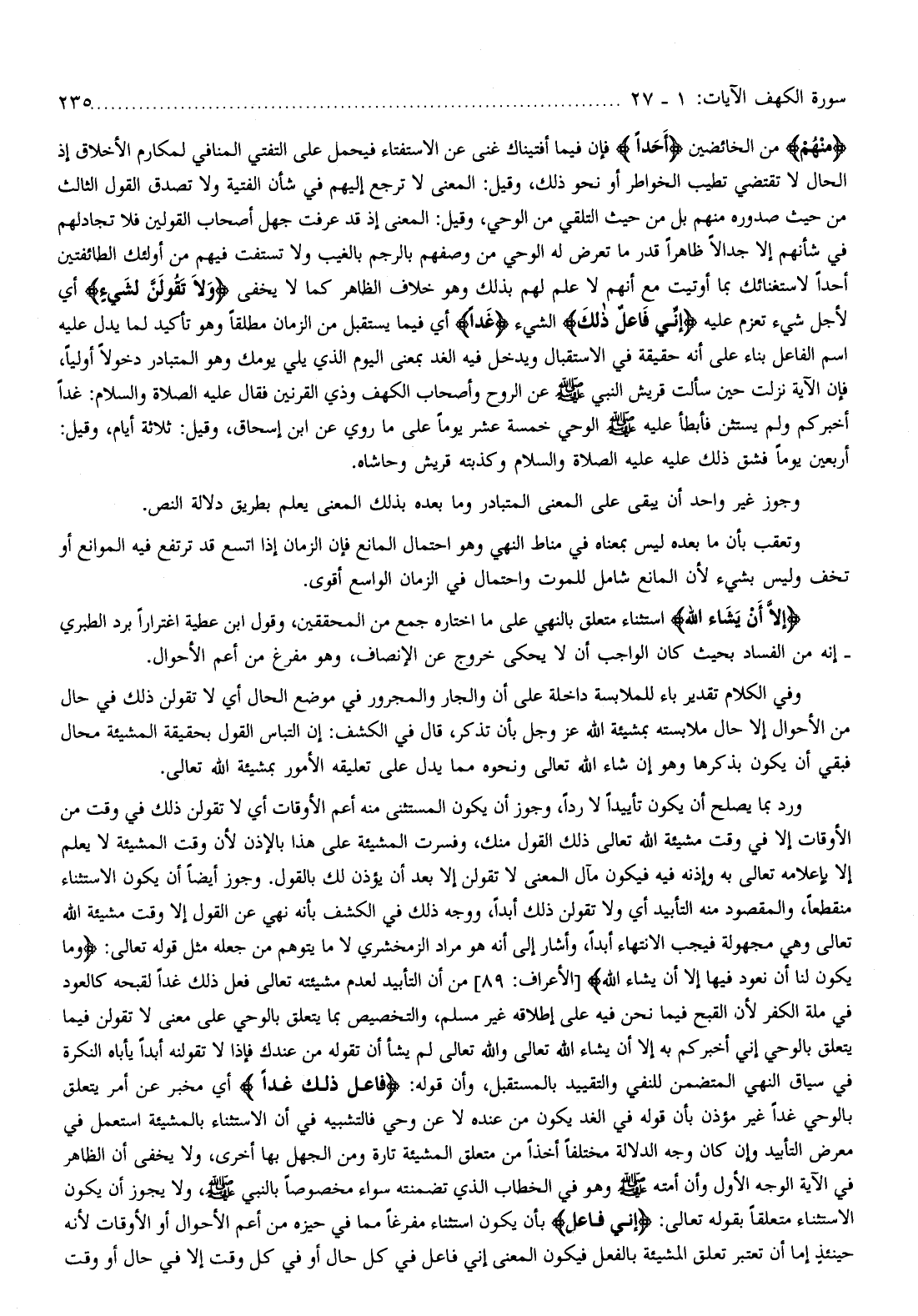 ورد بما يصلح أن يكون تأييدا لا ردا، وجوز أن يكون المستثنى منه أعم الأوقات أي لا تقولن ذلك في وقت من الأوقات إلا في وقت مشيئة الله تعالى ذلك القول منك، وفسرت المشيئة على هذا بالإذن لأن وقت المشيئة لا يعلم إلا بإعلامه تعالى به وإذنه فيه فيكون مآل المعنى لا تقولن إلا بعد أن يؤذن لك بالقول. وجوز أيضا أن يكون الاستثناء منقطعا، والمقصود منه التأبيد أي ولا تقولن ذلك أبدا، ووجه ذلك في الكشف بأنه نهي عن القول إلا وقت مشيئة الله تعالى وهي مجهولة فيجب الانتهاء أبدا، وأشار إلى أنه هو مراد الزمخشري لا ما يتوهم من جعله مثل قوله تعالى: وَما يَكُونُ لَنا أَنْ نَعُودَ فِيها إِلَّا أَنْ يَشاءَ اللَّهُ [الأعراف: 89] من أن التأبيد لعدم مشيئته تعالى فعل ذلك غدا لقبحه كالعود في ملة الكفر لأن القبح فيما نحن فيه على إطلاقه غير مسلم، والتخصيص بما يتعلق بالوحي على معنى لا تقولن فيما يتعلق بالوحي إني أخبركم به إلا أن يشاء الله تعالى والله تعالى لم يشأ أن تقوله من عندك فإذا لا تقولنه أبدا يأباه النكرة في سياق النهي المتضمن للنفي والتقييد بالمستقبل، وأن قوله: فاعِلٌ ذلِكَ غَداً أي مخبر عن أمر يتعلق بالوحي غدا غير مؤذن بأن قوله في الغد يكون من عنده لا عن وحي فالتشبيه في أن الاستثناء بالمشيئة استعمل في معرض التأبيد وإن كان وجه الدلالة مختلفا أخذا من متعلق المشيئة تارة ومن الجهل بها أخرى، ولا يخفى أن الظاهر في الآية الوجه الأول وأن أمته صلّى الله عليه وسلّم وهو في الخطاب الذي تضمنته سواء مخصوصا بالنبي صلّى الله عليه وسلّم، ولا يجوز أن يكون الاستثناء متعلقا بقوله تعالى: إِنِّي فاعِلٌ بأن يكون استثناء مفرغا مما في حيزه من أعم الأحوال أو الأوقات لأنه حينئذ إما أن تعتبر تعلق المشيئة بالفعل فيكون المعنى إني فاعل في كل حال أو في كل وقت إلا في حال أو وقت