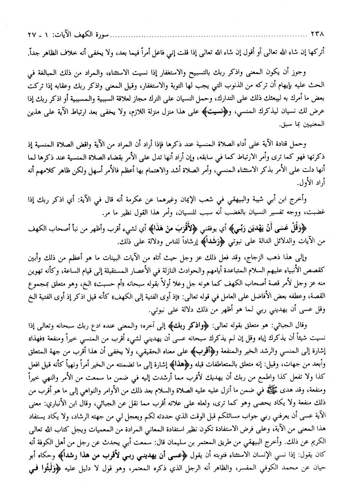وقال الجبائي: هو متعلق بقوله تعالى: وَاذْكُرْ رَبَّكَ إلى آخره والمعنى عنده ادع ربك سبحانه وتعالى إذا نسيت شيئا أن يذكرك إياه وقل إن لم يذكرك سبحانه عسى أن يهديني لشيء أقرب من المنسي خيرا ومنفعة «فهذا» إشارة إلى المنسي والرشد الخير والمنفعة و (أقرب) على معناه الحقيقي، ولا يخفى أن هذا أقرب من جهة المتعلق وأبعد من جهات، وقيل: إنه متعلق بالمتعاطفات قبله وهذا إشارة إلى ما تضمنته من الخير أمرا ونهيا كأنه قيل افعل كذا ولا تفعل كذا وأطمع من ربك أن يهديك لأقرب مما أرشدت إليه في ضمن ما سمعت من الأمر والنهي خيرا ومنفعة، وقد هدى صلّى الله عليه وسلّم في ضمن ما أنزل عليه عليه الصلاة والسلام بعد ذلك من الأوامر والنواهي إلى ما هو أقرب من ذلك منفعة ولا يكاد يحصى وهو كما ترى، ولعله على علاته أقرب مما نقل عن الجبائي، وقال ابن الأنباري: معنى الآية عسى أن يعرفني ربي جواب مسائلكم قبل الوقت الذي حددته لكم ويعجل لي من جهته الرشاد، ولا يكاد يستفاد هذا المعنى من الآية، وعلى فرض الاستفادة تكون نظير استفادة المعاني المرادة من المعميات ويجل كتاب الله تعالى الكريم عن ذلك. وأخرج البيهقي من طريق المعتمر بن سليمان قال: سمعت أبي يحدث عن رجل من أهل الكوفة أنه كان يقول: إذا نسي الإنسان الاستثناء فتوبته أن يقول عَسى أَنْ يَهْدِيَنِ رَبِّي لِأَقْرَبَ مِنْ هذا رَشَداً وحكاه أبو حيان عن محمد الكوفي المفسر، والظاهر أنه الرجل الذي ذكره المعتمر، وهو قول لا دليل عليه وَلَبِثُوا فِي