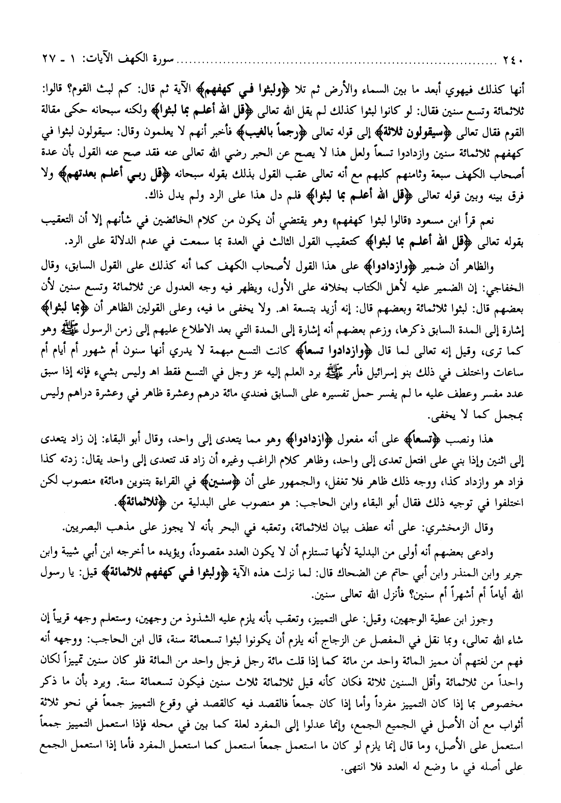 ثلاثمائة وتسع سنين فقال: لو كانوا لبثوا كذلك لم يقل الله تعالى قُلِ اللَّهُ أَعْلَمُ بِما لَبِثُوا ولكنه سبحانه حكى مقالة القوم فقال تعالى سَيَقُولُونَ ثَلاثَةٌ إلى قوله تعالى رَجْماً بِالْغَيْبِ فأخبر أنهم لا يعلمون وقال: سيقولون لبثوا في كهفهم ثلاثمائة سنين وازدادوا تسعا ولعل هذا لا يصح عن الحبر رضي الله تعالى عنه فقد صح عنه القول بأن عدة أصحاب الكهف سبعة وثامنهم كلبهم مع أنه تعالى عقب القول بذلك بقوله سبحانه قُلْ رَبِّي أَعْلَمُ بِعِدَّتِهِمْ ولا فرق بينه وبين قوله تعالى قُلِ اللَّهُ أَعْلَمُ بِما لَبِثُوا فلم دل هذا على الرد ولم يدل ذاك.