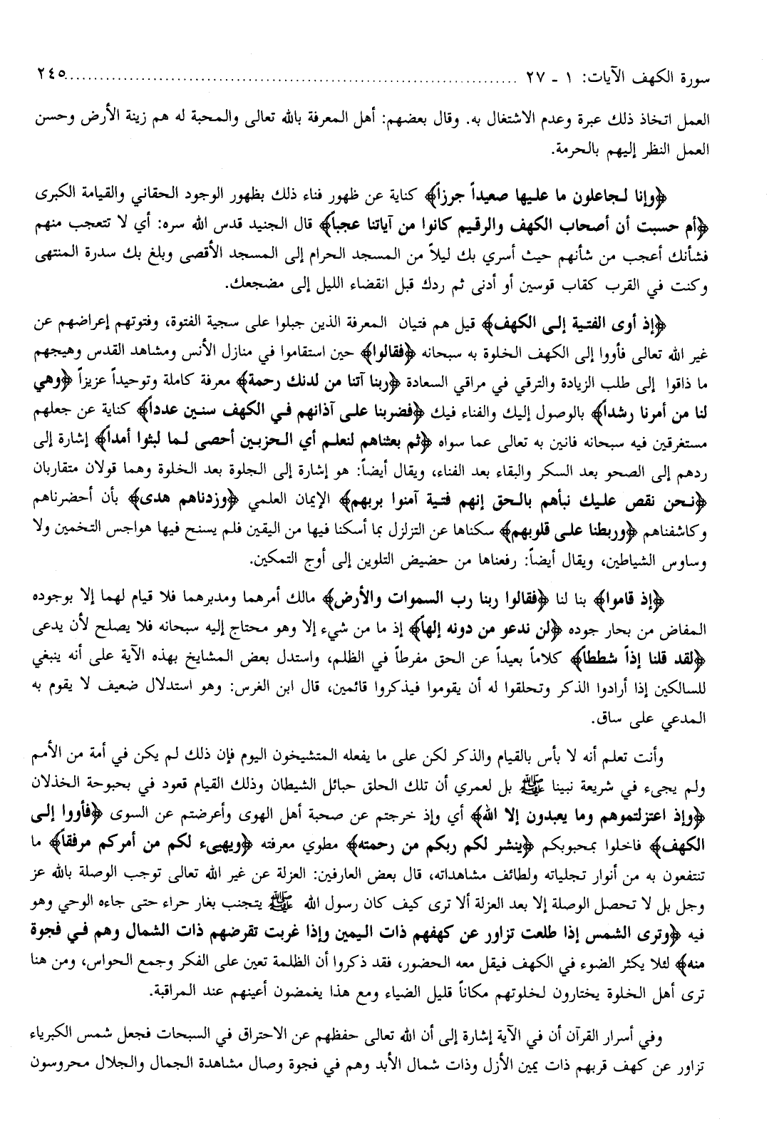 وَإِنَّا لَجاعِلُونَ ما عَلَيْها صَعِيداً جُرُزاً كناية عن ظهور فناء ذلك بظهور الوجود الحقاني والقيامة الكبرى أَمْ حَسِبْتَ أَنَّ أَصْحابَ الْكَهْفِ وَالرَّقِيمِ كانُوا مِنْ آياتِنا عَجَباً قال الجنيد قدس الله سره: أي لا تتعجب منهم فشأنك أعجب من شأنهم حيث أسري بك ليلا من المسجد الحرام إلى المسجد الأقصى وبلغ بك سدرة المنتهى وكنت في القرب كقاب قوسين أو أدنى ثم ردك قبل انقضاء الليل إلى مضجعك.