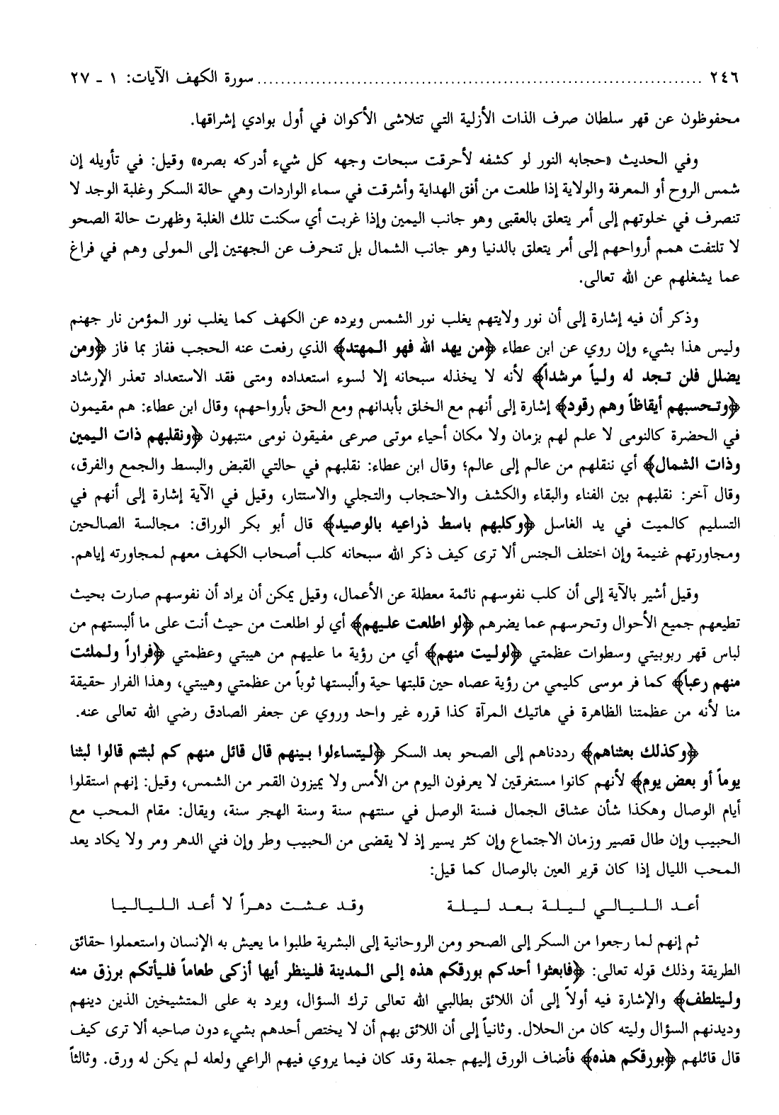 وذكر أن فيه إشارة إلى أن نور ولايتهم يغلب نور الشمس ويرده عن الكهف كما يغلب نور المؤمن نار جهنم وليس هذا بشيء وإن روي عن ابن عطاء مَنْ يَهْدِ اللَّهُ فَهُوَ الْمُهْتَدِ الذي رفعت عنه الحجب ففاز بما فاز وَمَنْ يُضْلِلْ فَلَنْ تَجِدَ لَهُ وَلِيًّا مُرْشِداً لأنه لا يخذله سبحانه إلا لسوء استعداده ومتى فقد الاستعداد تعذر الإرشاد وَتَحْسَبُهُمْ أَيْقاظاً وَهُمْ رُقُودٌ إشارة إلى أنهم مع الخلق بأبدانهم ومع الحق بأرواحهم، وقال ابن عطاء: هم مقيمون في الحضرة كالنومى لا علم لهم بزمان ولا مكان أحياء موتى صرعى مفيقون نومى منتبهون وَنُقَلِّبُهُمْ ذاتَ الْيَمِينِ وَذاتَ الشِّمالِ أي ننقلهم من عالم إلى عالم وقال ابن عطاء: نقلبهم في حالتي القبض والبسط والجمع والفرق، وقال آخر: نقلبهم بين الفناء والبقاء والكشف والاحتجاب والتجلي والاستتار، وقيل في الآية إشارة إلى أنهم في التسليم كالميت في يد الغاسل وَكَلْبُهُمْ باسِطٌ ذِراعَيْهِ بِالْوَصِيدِ قال أبو بكر الوراق: مجالسة الصالحين ومجاورتهم غنيمة وإن اختلف الجنس ألا ترى كيف ذكر الله سبحانه كلب أصحاب الكهف معهم لمجاورته إياهم.