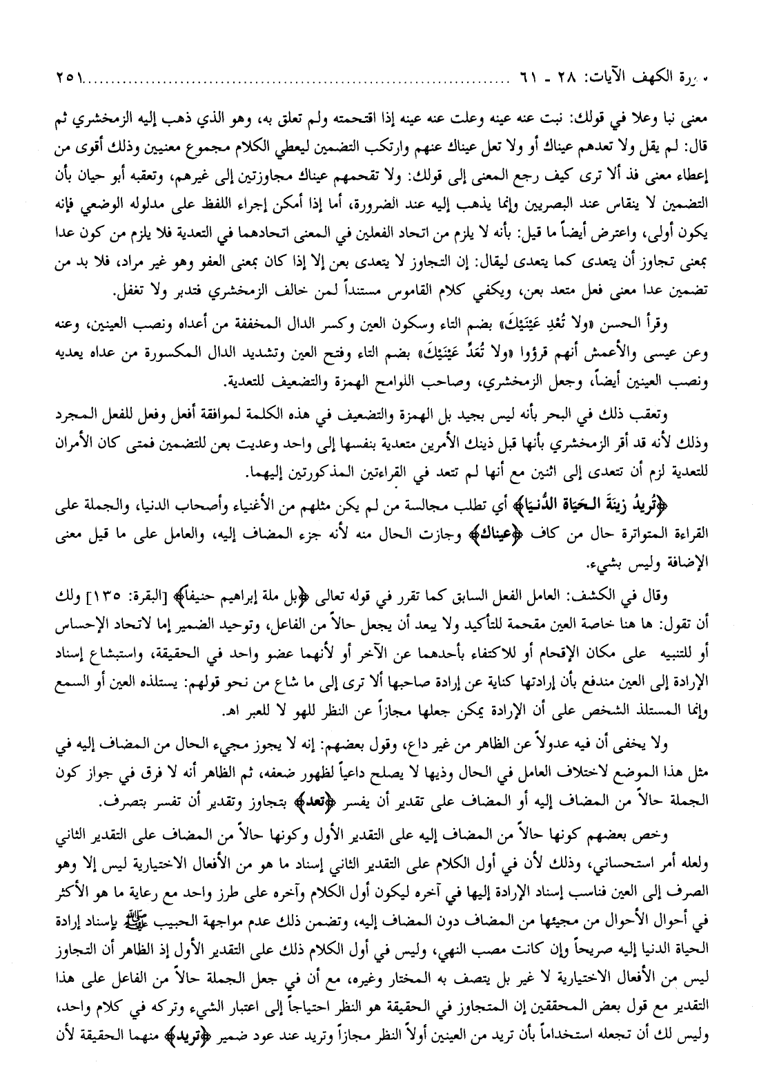معنى نبا وعلا في قولك: نبت عنه عينه وعلت عنه عينه إذا اقتحمته ولم تعلق به، وهو الذي ذهب إليه الزمخشري ثم قال: لم يقل ولا تعدهم عيناك أو ولا تعل عيناك عنهم وارتكب التضمين ليعطي الكلام مجموع معنيين وذلك أقوى من إعطاء معنى فذ ألا ترى كيف رجع المعنى إلى قولك: ولا تقحمهم عيناك مجاوزتين إلى غيرهم، وتعقبه أبو حيان بأن التضمين لا ينقاس عند البصريين وإنما يذهب إليه عند الضرورة، أما إذا أمكن إجراء اللفظ على مدلوله الوضعي فإنه يكون أولى، واعترض أيضا ما قيل: بأنه لا يلزم من اتحاد الفعلين في المعنى اتحادهما في التعدية فلا يلزم من كون عدا بمعنى تجاوز أن يتعدى كما يتعدى ليقال: إن التجاوز لا يتعدى بعن إلا إذا كان بمعنى العفو وهو غير مراد، فلا بد من تضمين عدا معنى فعل متعد بعن، ويكفي كلام القاموس مستندا لمن خالف الزمخشري فتدبر ولا تغفل.