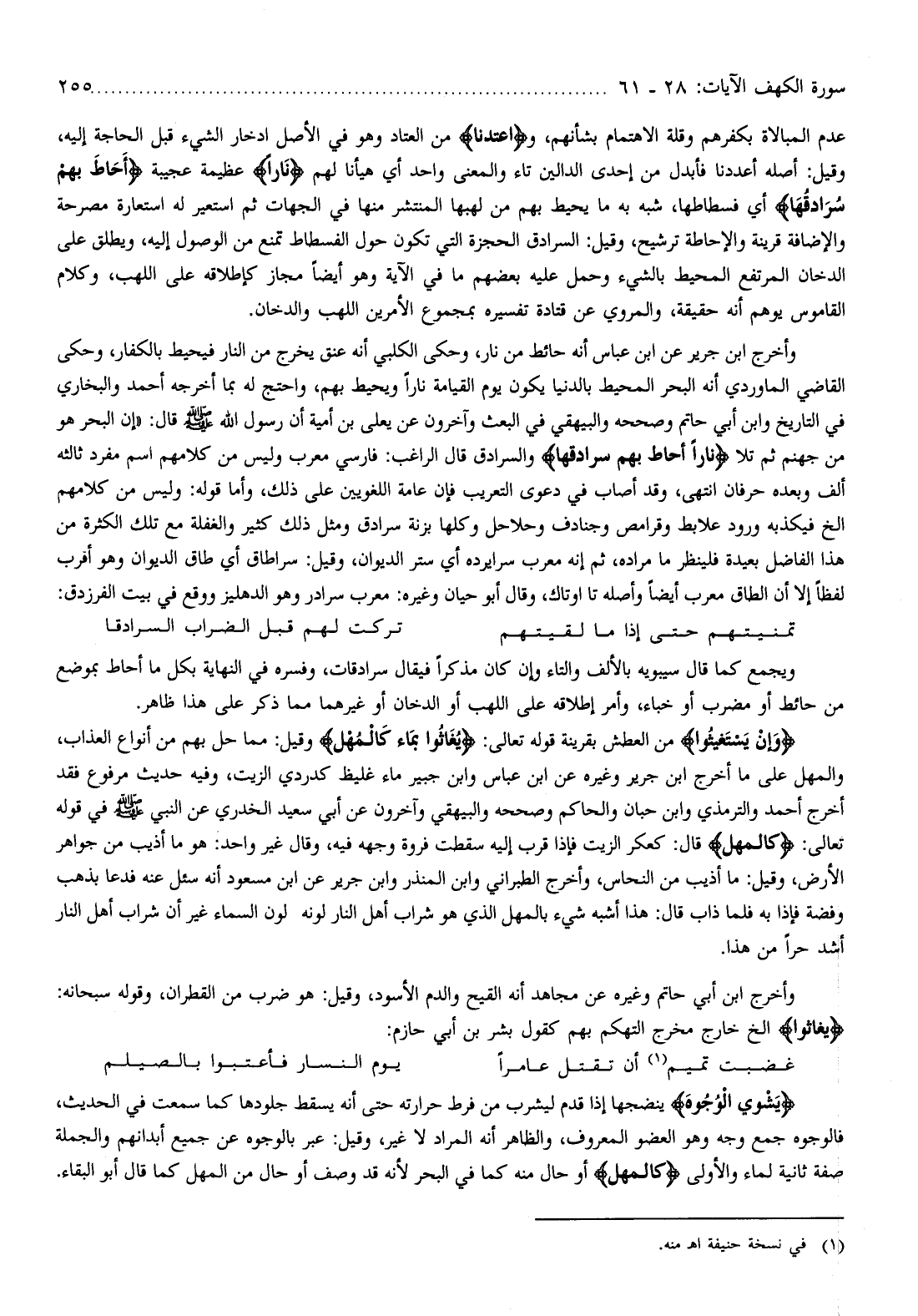 عدم المبالاة بكفرهم وقلة الاهتمام بشأنهم، وأَعْتَدْنا من العتاد وهو في الأصل ادخار الشيء قبل الحاجة إليه، وقيل: أصله أعددنا فأبدل من إحدى الدالين تاء والمعنى واحد أي هيأنا لهم ناراً عظيمة عجيبة أَحاطَ بِهِمْ سُرادِقُها أي فسطاطها، شبه به ما يحيط بهم من لهبها المنتشر منها في الجهات ثم استعير له استعارة مصرحة والإضافة قرينة والإحاطة ترشيح، وقيل: السرادق الحجزة التي تكون حول الفسطاط تمنع من الوصول إليه، ويطلق على الدخان المرتفع المحيط بالشيء وحمل عليه بعضهم ما في الآية وهو أيضا مجاز كإطلاقه على اللهب، وكلام القاموس يوهم أنه حقيقة، والمروي عن قتادة تفسيره بمجموع الأمرين اللهب والدخان.