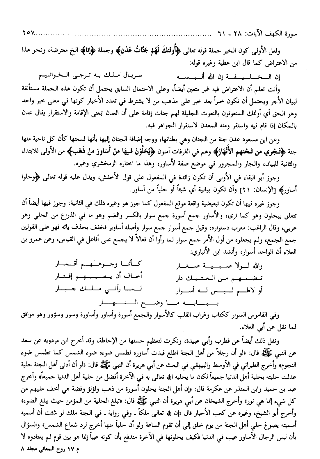 وجوز غيره فيها أن تكون تبعيضية واقعة موقع المفعول كما جوز هو وغيره ذلك في الثانية، وجوز فيها أيضا أن تتعلق بيحلون وهو كما ترى، والأساور جمع أسورة جمع سوار بالكسر والضم وهو ما في الذراع من الحلي وهو عربي، وقال الراغب: معرب دستواره، وقيل جمع أسوار جمع سوار وأصله أساوير فخفف بحذف يائه فهو على القولين جمع الجمع، ولم يجعلوه من أول الأمر جمع سوار لما رأوا أن فعالا لا يجمع على أفاعل في القياس، وعن عمرو بن العلاء أن الواحد أسوار، وأنشد ابن الأنباري: