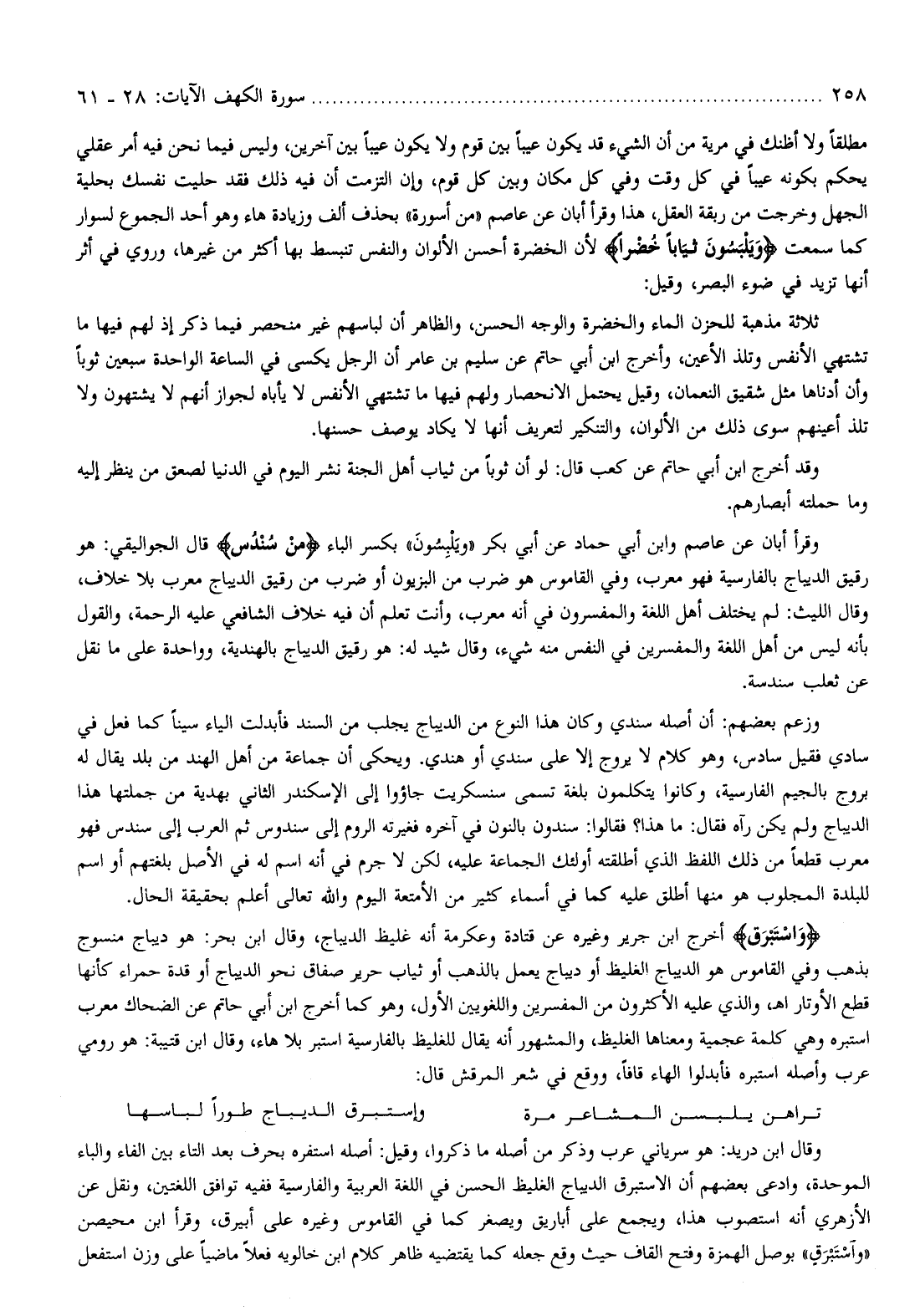 وَإِسْتَبْرَقٍ أخرج ابن جرير وغيره عن قتادة وعكرمة أنه غليظ الديباج، وقال ابن بحر: هو ديباج منسوج بذهب وفي القاموس هو الديباج الغليظ أو ديباج يعمل بالذهب أو ثياب حرير صفاق نحو الديباج أو قدة حمراء كأنها قطع الأوتار اه، والذي عليه الأكثرون من المفسرين واللغويين الأول، وهو كما أخرج ابن أبي حاتم عن الضحاك معرب استبره وهي كلمة عجمية ومعناها الغليظ، والمشهور أنه يقال للغليظ بالفارسية استبر بلا هاء، وقال ابن قتيبة: هو رومي عرب وأصله استبره فأبدلوا الهاء قافا، ووقع في شعر المرقش قال: