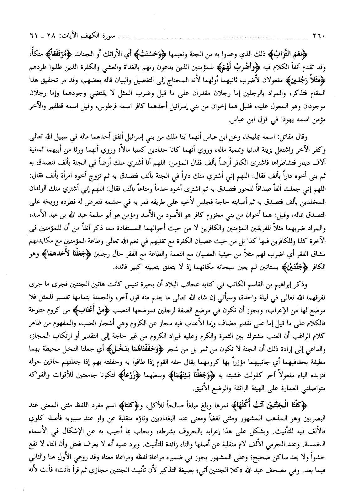 كِلْتَا الْجَنَّتَيْنِ آتَتْ أُكُلَها ثمرها وبلغ مبلغا صالحا للأكل، وكِلْتَا اسم مفرد اللفظ مثنى المعنى عند البصريين وهو المذهب المشهور ومثنى لفظا ومعنى عند البغداديين وتاؤه منقلبة عن واو عند سيبويه فأصله كلوي فالألف فيه للتأنيث. ويشكل على هذا إعرابه بالحروف بشرطه، ويجاب بما أجيب به عن الإشكال في الأسماء الخمسة. وعند الجرمي الألف لام منقلبة عن أصلها والتاء زائدة للتأنيث. ويرد عليه أنه لا يعرف فعتل وأن التاء لا تقع حشوا ولا بعد ساكن صحيح وعلى المشهور يجوز في ضميره مراعاة لفظه ومراعاة معناه وقد روعي الأول هنا والثاني فيما بعد. وفي مصحف عبد الله «كلا الجنتين آتي» بصيغة التذكير لأن تأنيث الجنتين مجازي ثم قرأ «آتت» فأنث لأنه