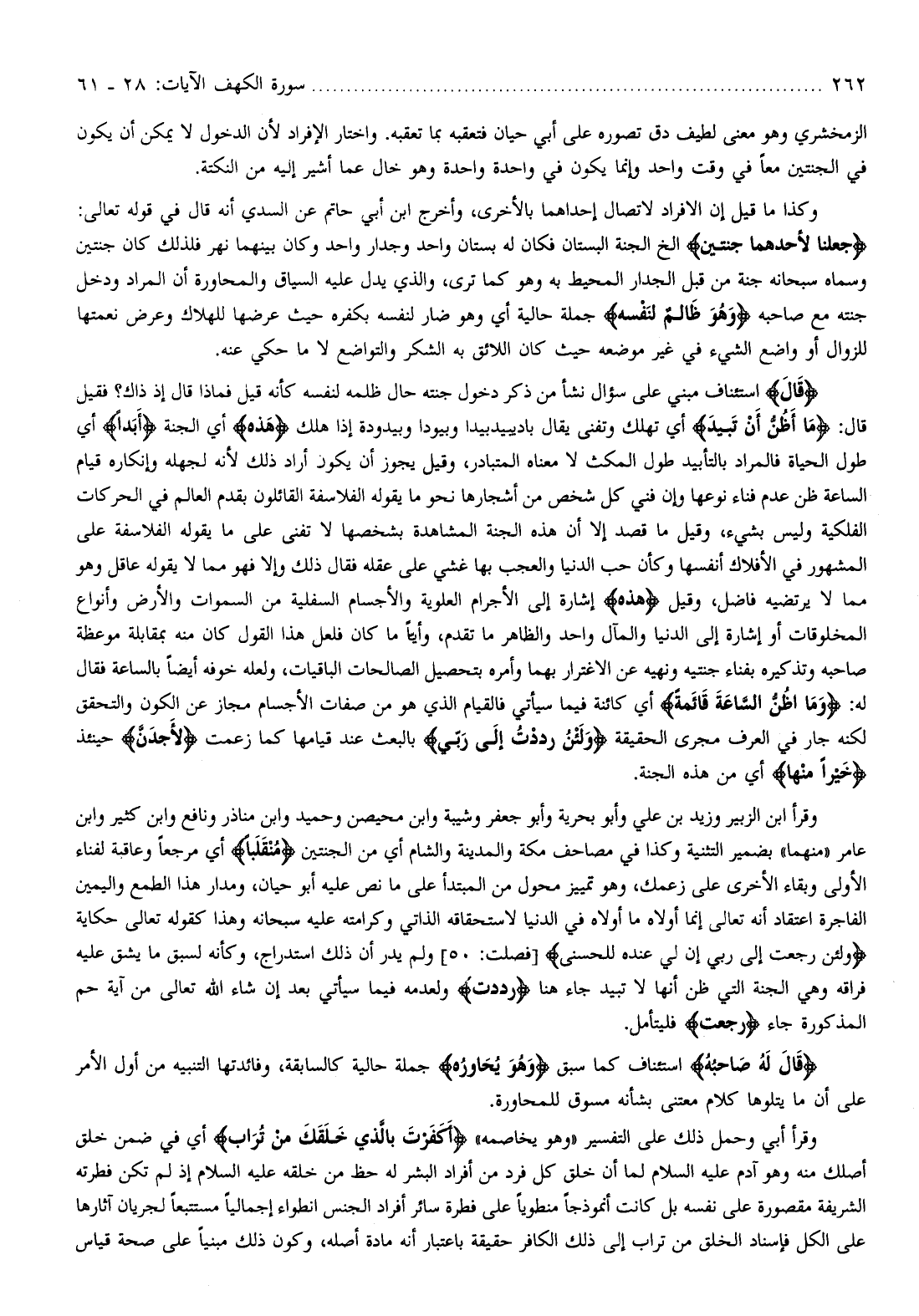 جَعَلْنا لِأَحَدِهِما جَنَّتَيْنِ إلخ الجنة البستان فكان له بستان واحد وجدار واحد وكان بينهما نهر فلذلك كان جنتين وسماه سبحانه جنة من قبل الجدار المحيط به وهو كما ترى، والذي يدل عليه السياق والمحاورة أن المراد ودخل جنته مع صاحبه وَهُوَ ظالِمٌ لِنَفْسِهِ جملة حالية أي وهو ضار لنفسه بكفره حيث عرضها للهلاك وعرض نعمتها للزوال أو واضع الشيء في غير موضعه حيث كان اللائق به الشكر والتواضع لا ما حكي عنه.