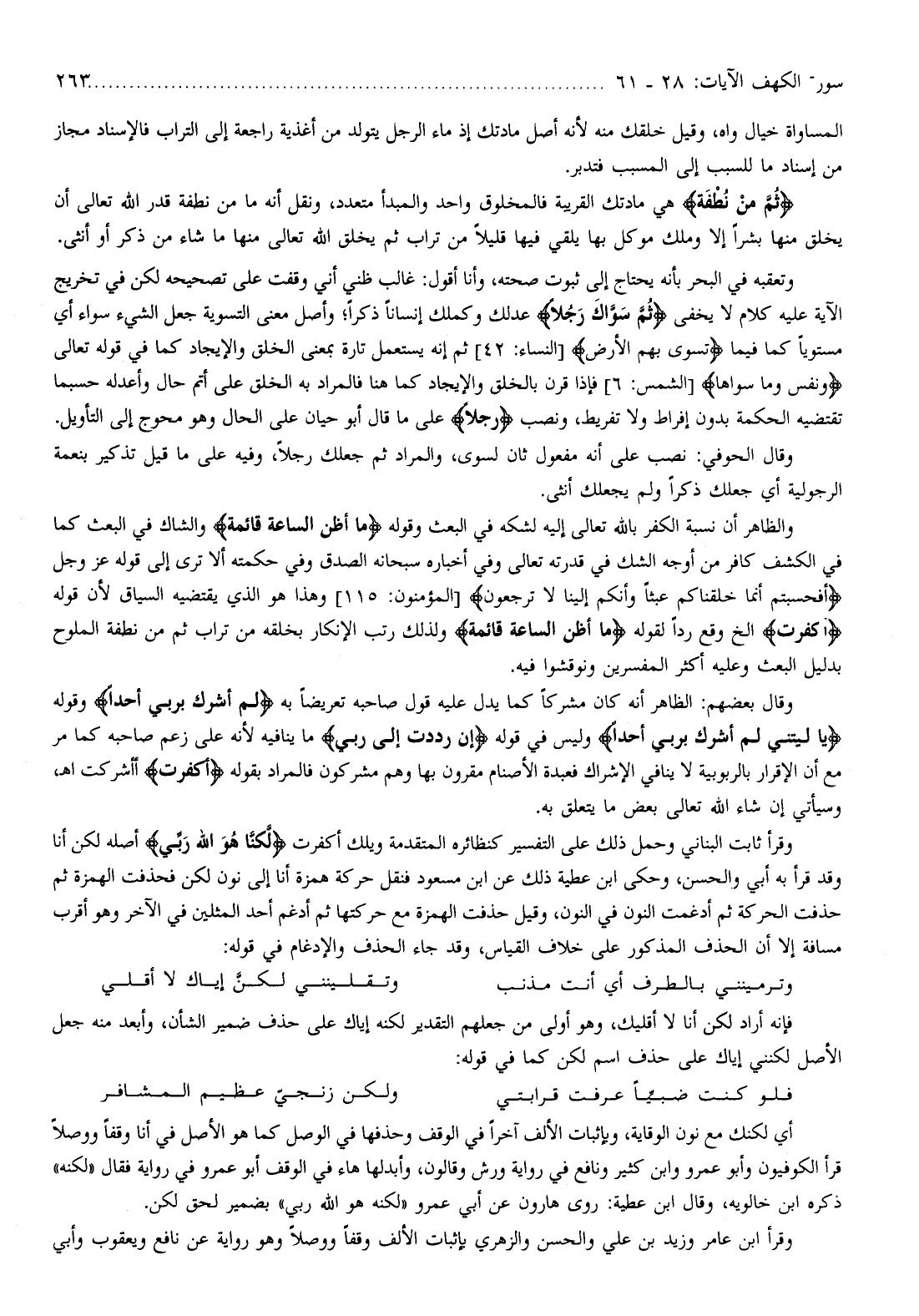 أي لكنك مع نون الوقاية، وبإثبات الألف آخرا في الوقف وحذفها في الوصل كما هو الأصل في أنا وقفا ووصلا قرأ الكوفيون وأبو عمرو وابن كثير ونافع في رواية ورش وقالون، وأبدلها هاء في الوقف أبو عمرو في رواية فقال «لكنه» ذكره ابن خالويه، وقال ابن عطية: روى هارون عن أبي عمرو «لكنه هو الله ربي» بضمير لحق لكن.
