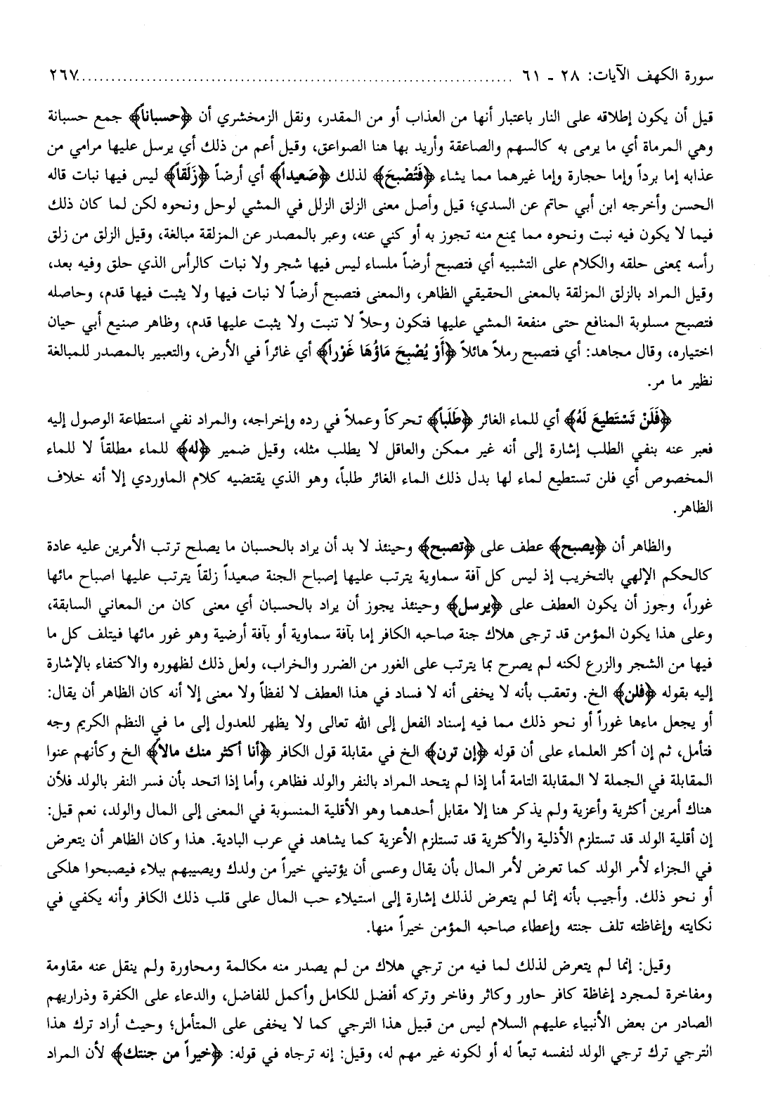 قيل أن يكون إطلاقه على النار باعتبار أنها من العذاب أو من المقدر، ونقل الزمخشري أن حُسْباناً جمع حسبانة وهي المرماة أي ما يرمى به كالسهم والصاعقة وأريد بها هنا الصواعق، وقيل أعم من ذلك أي يرسل عليها مرامي من عذابه إما بردا وإما حجارة وإما غيرهما مما يشاء فَتُصْبِحَ لذلك صَعِيداً أي أرضا زَلَقاً ليس فيها نبات قاله الحسن وأخرجه ابن أبي حاتم عن السدي قيل وأصل معنى الزلق الزلل في المشي لوحل ونحوه لكن لما كان ذلك فيما لا يكون فيه نبت ونحوه مما يمنع منه تجوز به أو كني عنه، وعبر بالمصدر عن المزلقة مبالغة، وقيل الزلق من زلق رأسه بمعنى حلقه والكلام على التشبيه أي فتصبح أرضا ملساء ليس فيها شجر ولا نبات كالرأس الذي حلق وفيه بعد، وقيل المراد بالزلق المزلقة بالمعنى الحقيقي الظاهر، والمعنى فتصبح أرضا لا نبات فيها ولا يثبت فيها قدم، وحاصله فتصبح مسلوبة المنافع حتى منفعة المشي عليها فتكون وحلا لا تنبت ولا يثبت عليها قدم، وظاهر صنيع أبي حيان اختياره، وقال مجاهد: أي فتصبح رملا هائلا أَوْ يُصْبِحَ ماؤُها غَوْراً أي غائرا في الأرض، والتعبير بالمصدر للمبالغة نظير ما مر.