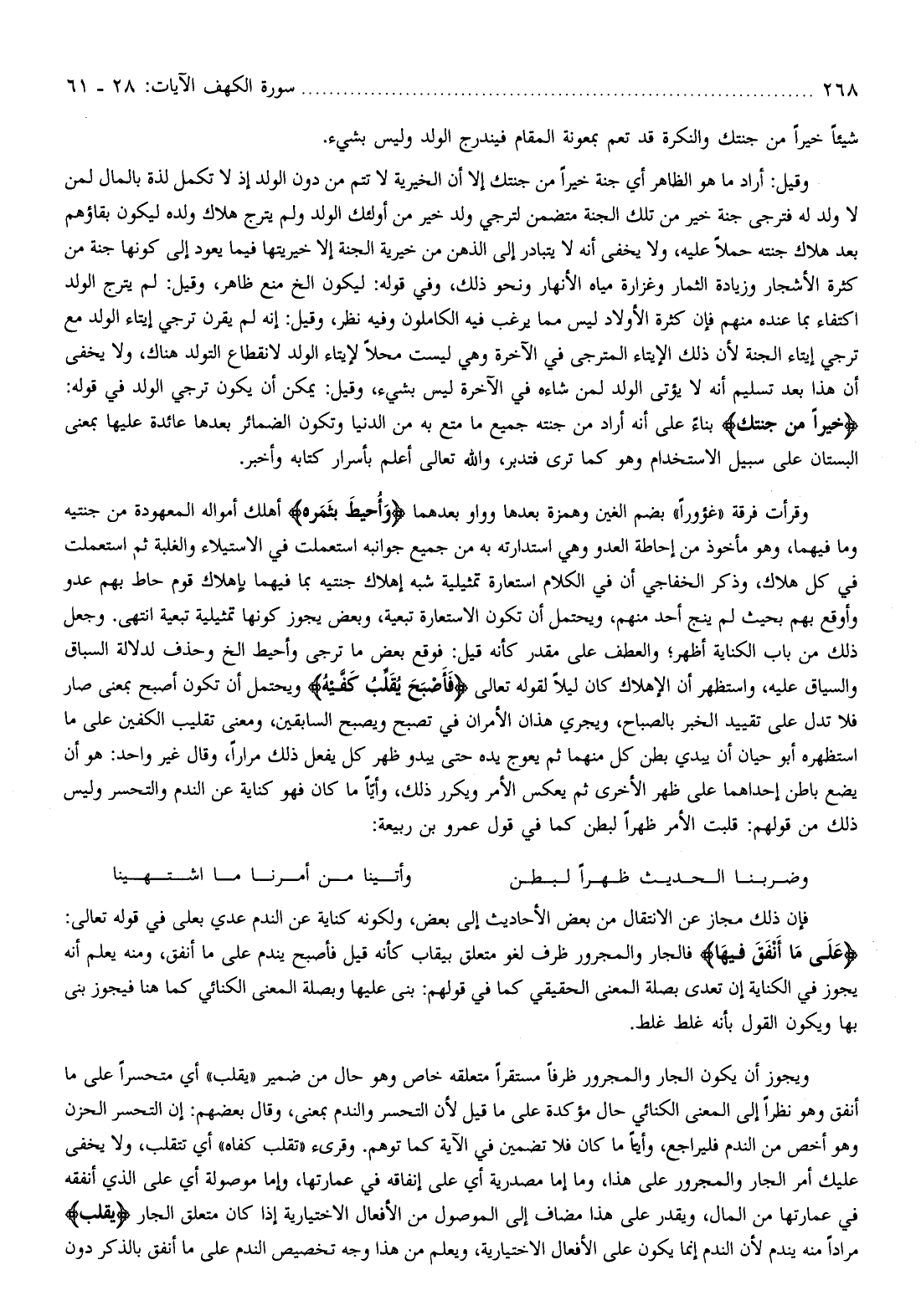 ويجوز أن يكون الجار والمجرور ظرفا مستقرا متعلقه خاص وهو حال من ضمير «يقلب» أي متحسرا على ما أنفق وهو نظرا إلى المعنى الكنائي حال مؤكدة على ما قيل لأن التحسر والندم بمعنى، وقال بعضهم: إن التحسر الحزن وهو أخص من الندم فليراجع، وأيّا ما كان فلا تضمين في الآية كما توهم. وقرىء «تقلب كفاه» أي تتقلب، ولا يخفى عليك أمر الجار والمجرور على هذا، وما إما مصدرية أي على إنفاقه في عمارتها، وإما موصولة أي على الذي أنفقه في عمارتها من المال، ويقدر على هذا مضاف إلى الموصول من الأفعال الاختيارية إذا كان متعلق الجار يُقَلِّبُ مرادا منه يندم لأن الندم إنما يكون على الأفعال الاختيارية، ويعلم من هذا وجه تخصيص الندم على ما أنفق بالذكر دون