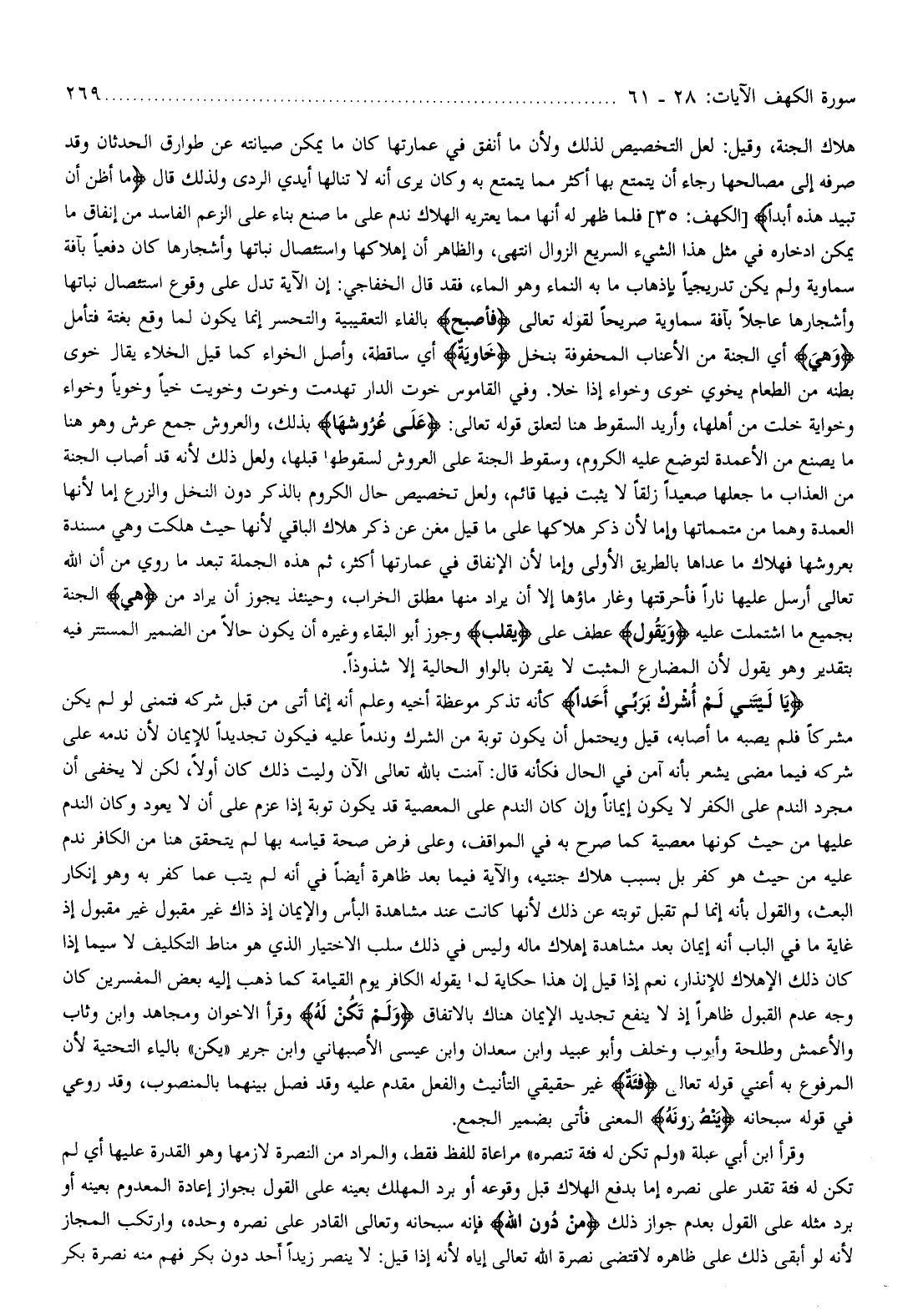 هلاك الجنة، وقيل: لعل التخصيص لذلك ولأن ما أنفق في عمارتها كان ما يمكن صيانته عن طوارق الحدثان وقد صرفه إلى مصالحها رجاء أن يتمتع بها أكثر مما يتمتع به وكان يرى أنه لا تنالها أيدي الردى ولذلك قال ما أَظُنُّ أَنْ تَبِيدَ هذِهِ أَبَداً [الكهف: 35] فلما ظهر له أنها مما يعتريه الهلاك ندم على ما صنع بناء على الزعم الفاسد من إنفاق ما يمكن ادخاره في مثل هذا الشيء السريع الزوال انتهى، والظاهر أن إهلاكها واستئصال نباتها وأشجارها كان دفعيا بآفة سماوية ولم يكن تدريجيا بإذهاب ما به النماء وهو الماء، فقد قال الخفاجي: إن الآية تدل على وقوع استئصال نباتها وأشجارها عاجلا بآفة سماوية صريحا لقوله تعالى فَأَصْبَحَ بالفاء التعقيبية والتحسر إنما يكون لما وقع بغتة فتأمل وَهِيَ أي الجنة من الأعناب المحفوفة بنخل خاوِيَةٌ أي ساقطة، وأصل الخواء كما قيل الخلاء يقال خوى بطنه من الطعام يخوي خوى وخواء إذا خلا. وفي القاموس خوت الدار تهدمت وخوت وخويت خيا وخويا وخواء وخواية خلت من أهلها، وأريد السقوط هنا لتعلق قوله تعالى: عَلى عُرُوشِها بذلك، والعروش جمع عرش وهو هنا ما يصنع من الأعمدة لتوضع عليه الكروم، وسقوط الجنة على العروش لسقوطها قبلها، ولعل ذلك لأنه قد أصاب الجنة من العذاب ما جعلها صعيدا زلقا لا يثبت فيها قائم، ولعل تخصيص حال الكروم بالذكر دون النخل والزرع إما لأنها العمدة وهما من متمماتها وإما لأن ذكر هلاكها على ما قيل مغن عن ذكر هلاك الباقي لأنها حيث هلكت وهي مسندة بعروشها فهلاك ما عداها بالطريق الأولى وإما لأن الإنفاق في عمارتها أكثر، ثم هذه الجملة تبعد ما روي من أن الله تعالى أرسل عليها نارا فأحرقتها وغار ماؤها إلا أن يراد منها مطلق الخراب، وحينئذ يجوز أن يراد من هِيَ الجنة بجميع ما اشتملت عليه وَيَقُولُ عطف على يُقَلِّبُ وجوز أبو البقاء وغيره أن يكون حالا من الضمير المستتر فيه بتقدير وهو يقول لأن المضارع المثبت لا يقترن بالواو الحالية إلا شذوذا.