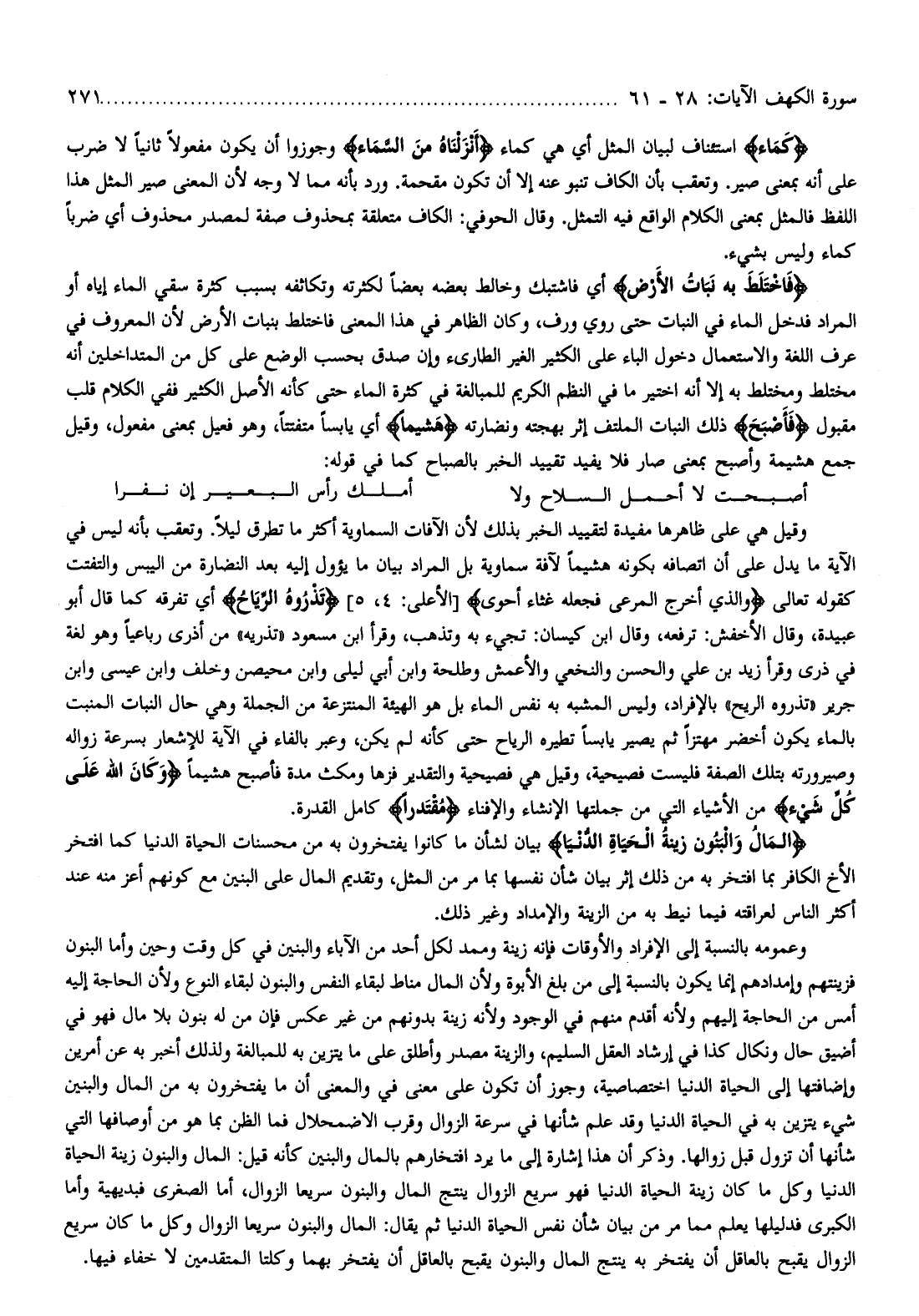 الْمالُ وَالْبَنُونَ زِينَةُ الْحَياةِ الدُّنْيا بيان لشأن ما كانوا يفتخرون به من محسنات الحياة الدنيا كما افتخر الأخ الكافر بما افتخر به من ذلك إثر بيان شأن نفسها بما مر من المثل، وتقديم المال على البنين مع كونهم أعز منه عند أكثر الناس لعراقته فيما نيط به من الزينة والإمداد وغير ذلك.