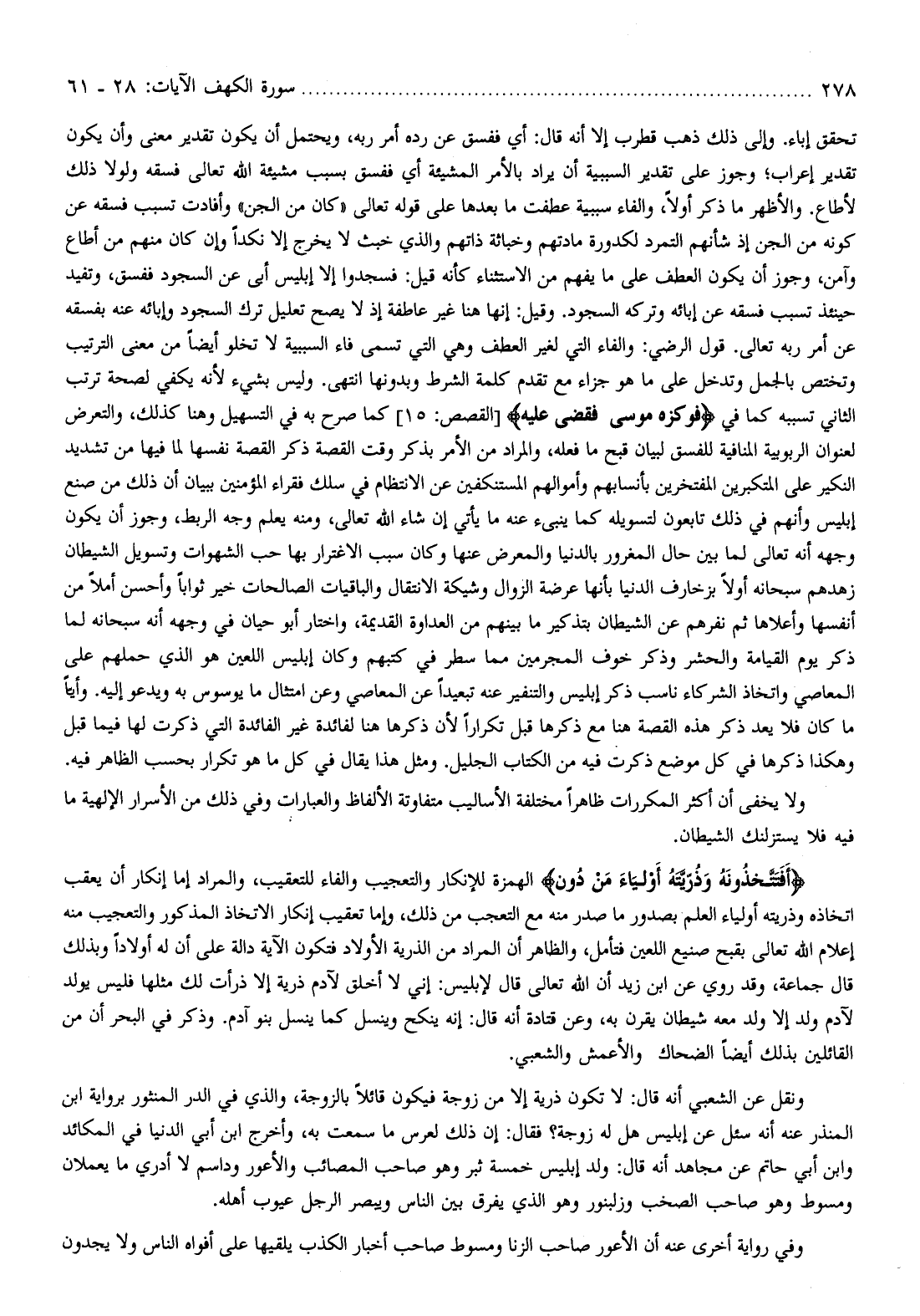 تحقق إباء. وإلى ذلك ذهب قطرب إلا أنه قال: أي ففسق عن رده أمر ربه، ويحتمل أن يكون تقدير معنى وأن يكون تقدير إعراب وجوز على تقدير السببية أن يراد بالأمر المشيئة أي ففسق بسبب مشيئة الله تعالى فسقه ولولا ذلك لأطاع. والأظهر ما ذكر أولا، والفاء سببية عطفت ما بعدها على قوله تعالى «كان من الجن» وأفادت تسبب فسقه عن كونه من الجن إذ شأنهم التمرد لكدورة مادتهم وخباثة ذاتهم والذي خبث لا يخرج إلا نكدا وإن كان منهم من أطاع وآمن، وجوز أن يكون العطف على ما يفهم من الاستثناء كأنه قيل: فسجدوا إلا إبليس أبى عن السجود ففسق، وتفيد حينئذ تسبب فسقه عن إبائه وتركه السجود. وقيل: إنها هنا غير عاطفة إذ لا يصح تعليل ترك السجود وإبائه عنه بفسقه عن أمر ربه تعالى. قول الرضي: والفاء التي لغير العطف وهي التي تسمى فاء السببية لا تخلو أيضا من معنى الترتيب وتختص بالجمل وتدخل على ما هو جزاء مع تقدم كلمة الشرط وبدونها انتهى. وليس بشيء لأنه يكفي لصحة ترتب الثاني تسببه كما في فَوَكَزَهُ مُوسى فَقَضى عَلَيْهِ [القصص: 15] كما صرح به في التسهيل وهنا كذلك، والتعرض لعنوان الربوبية المنافية للفسق لبيان قبح ما فعله، والمراد من الأمر بذكر وقت القصة ذكر القصة نفسها لما فيها من تشديد النكير على المتكبرين المفتخرين بأنسابهم وأموالهم المستنكفين عن الانتظام في سلك فقراء المؤمنين ببيان أن ذلك من صنع إبليس وأنهم في ذلك تابعون لتسويله كما ينبىء عنه ما يأتي إن شاء الله تعالى، ومنه يعلم وجه الربط، وجوز أن يكون وجهه أنه تعالى لما بين حال المغرور بالدنيا والمعرض عنها وكان سبب الاغترار بها حب الشهوات وتسويل الشيطان زهدهم سبحانه أولا بزخارف الدنيا بأنها عرضة الزوال وشيكة الانتقال والباقيات الصالحات خير ثوابا وأحسن أملا من أنفسها وأعلاها ثم نفرهم عن الشيطان بتذكير ما بينهم من العداوة القديمة، واختار أبو حيان في وجهه أنه سبحانه لما ذكر يوم القيامة والحشر وذكر خوف المجرمين مما سطر في كتبهم وكان إبليس اللعين هو الذي حملهم على المعاصي واتخاذ الشركاء ناسب ذكر إبليس والتنفير عنه تبعيدا عن المعاصي وعن امتثال ما يوسوس به ويدعو إليه. وأيّا ما كان فلا يعد ذكر هذه القصة هنا مع ذكرها قبل تكرارا لأن ذكرها هنا لفائدة غير الفائدة التي ذكرت لها فيما قبل وهكذا ذكرها في كل موضع ذكرت فيه من الكتاب الجليل. ومثل هذا يقال في كل ما هو تكرار بحسب الظاهر فيه.