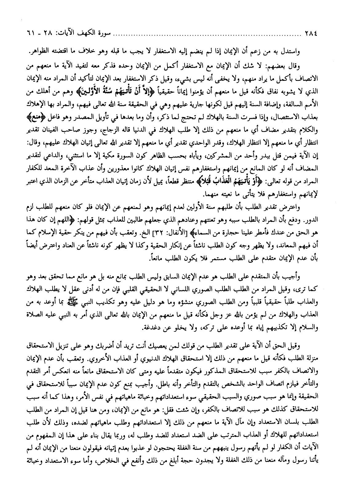 إن الآية فيمن قتل ببدر وأحد من المشركين، ويأباه بحسب الظاهر كون السورة مكية إلا ما استثني، والداعي لتقدير المضاف أنه لو كان المانع من إيمانهم واستغفارهم نفس إتيان الهلاك كانوا معذورين وأن عذاب الآخرة المعد للكفار المراد من قوله تعالى: أَوْ يَأْتِيَهُمُ الْعَذابُ قُبُلًا منتظر قطعا، يميل لأن زمان إتيان العذاب متأخر عن الزمان الذي اعتبر لإيمانهم واستغفارهم فلا يتأتى ما نعيته منهما.