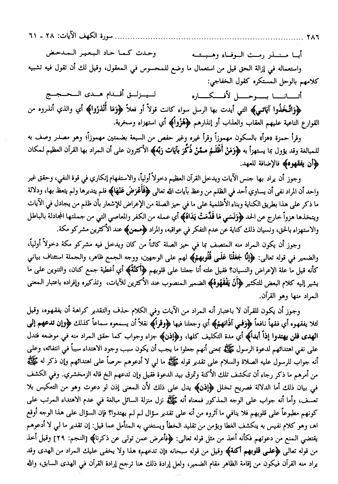 وقرأ حمزة «هزأ» بالسكون مهموزا وقرأ غيره وغير حفص من السبعة بضمتين مهموزا وهو مصدر وصف به للمبالغة وقد يؤول بما يستهزأ به وَمَنْ أَظْلَمُ مِمَّنْ ذُكِّرَ بِآياتِ رَبِّهِ الأكثرون على أن المراد بها القرآن العظيم لمكان أَنْ يَفْقَهُوهُ فالإضافة للعهد.