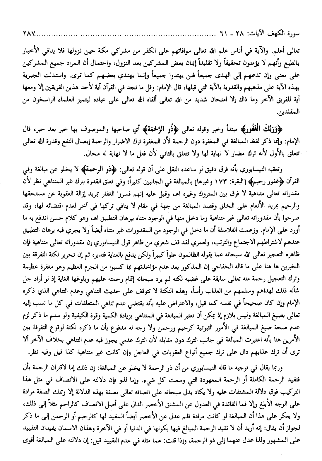 وتعقبه النيسابوري بأنه فرق دقيق لو ساعده النقل على أن قوله تعالى: ذُو الرَّحْمَةِ لا يخلو عن مبالغة وفي القرآن غَفُورٌ رَحِيمٌ [البقرة: 173 وغيرها] بالمبالغة في الجانبين كثيرا وفي تعلق القدرة بترك غير المتناهي نظر لأن مقدراته تعالى متناهية لا فرق بين المتروك وغيره اه، وقيل عليه إنهم فسروا الغفار بمريد إزالة العقوبة عن مستحقها والرحيم بمريد الأنعام على الخلق وقصد المبالغة من جهة في مقام لا ينافي تركها في آخر لعدم اقتضائه لها، وقد صرحوا بأن مقدوراته تعالى غير متناهية وما دخل منها في الوجود متناه ببرهان التطبيق اه، وهو كلام حسن اندفع به ما أورد على الإمام. وزعمت الفلاسفة أن ما دخل في الوجود من المقدورات غير متناه أيضا ولا يجري فيه برهان التطبيق عندهم لاشتراطهم الاجتماع والترتب، ولعمري لقد قف شعري من ظاهر قول النيسابوري إن مقدوراته تعالى متناهية فإن ظاهره التعجيز تعالى الله سبحانه عما يقوله الظالمون علوا كبيرا ولكن يدفع بالعناية فتدبر، ثم إن تحرير نكتة التفرقة بين الخبرين هاهنا على ما قاله الخفاجي إن المذكور بعد عدم مؤاخذتهم بما كسبوا من الجرم العظيم وهو مغفرة عظيمة وترك التعجيل رحمة منه تعالى سابقة على غضبه لكنه لم يرد سبحانه إتمام رحمته عليهم وبلوغها الغاية إذ لو أراد جل شأنه ذلك لهداهم وسلمهم من العذاب رأسا، وهذه النكتة لا تتوقف على حديث التناهي وعدم التناهي الذي ذكره الإمام وإن كان صحيحا في نفسه كما قيل، والاعتراض عليه بأنه يقتضي عدم تناهي المتعلقات في كل ما نسب إليه تعالى بصيغ المبالغة وليس بلازم إذ يمكن أن تعتبر المبالغة في المتناهي بزيادة الكمية وقوة الكيفية ولو سلم ما ذكر لزم عدم صحة صيغ المبالغة في الأمور الثبوتية كرحيم ورحمن ولا وجه له مدفوع بأن ما ذكره نكتة لوقوع التفرقة بين الأمرين هنا بأنه اعتبرت المبالغة في جانب الترك دون مقابله لأن الترك عدمي يجوز فيه عدم التناهي بخلاف الآخر ألا ترى أن ترك عذابهم دال على ترك جميع أنواع العقوبات في العاجل وإن كانت غير متناهية كذا قيل وفيه نظر.