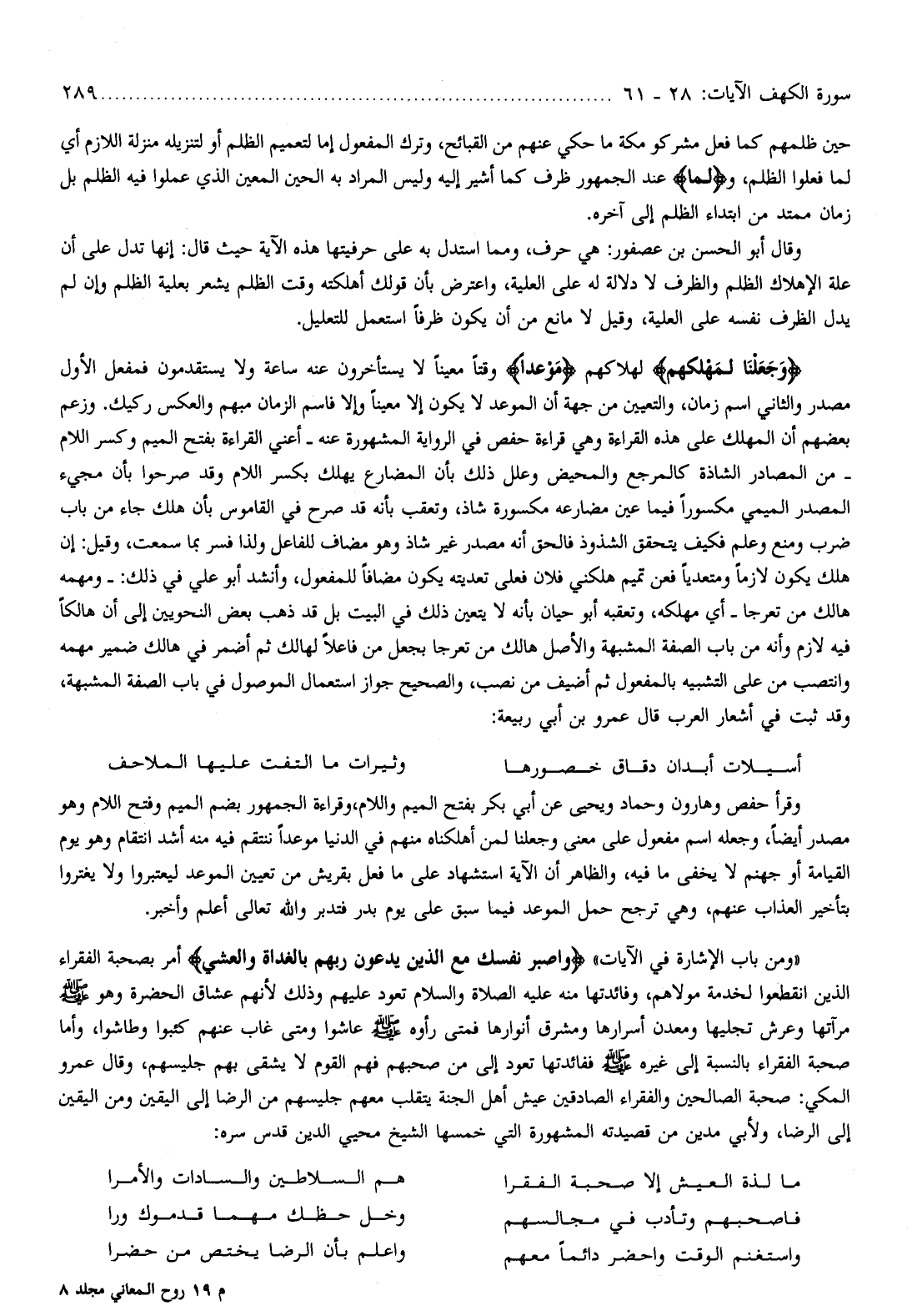 «ومن باب الإشارة في الآيات» وَاصْبِرْ نَفْسَكَ مَعَ الَّذِينَ يَدْعُونَ رَبَّهُمْ بِالْغَداةِ وَالْعَشِيِّ أمر بصحبة الفقراء الذين انقطعوا لخدمة مولاهم، وفائدتها منه عليه الصلاة والسلام تعود عليهم وذلك لأنهم عشاق الحضرة وهو صلّى الله عليه وسلّم مرآتها وعرش تجليها ومعدن أسرارها ومشرق أنوارها فمتى رأوه صلّى الله عليه وسلّم عاشوا ومتى غاب عنهم كئبوا وطاشوا، وأما صحبة الفقراء بالنسبة إلى غيره صلّى الله عليه وسلّم ففائدتها تعود إلى من صحبهم فهم القوم لا يشقى بهم جليسهم، وقال عمرو المكي: صحبة الصالحين والفقراء الصادقين عيش أهل الجنة يتقلب معهم جليسهم من الرضا إلى اليقين ومن اليقين إلى الرضا، ولأبي مدين من قصيدته المشهورة التي خمسها الشيخ محيي الدين قدس سره: