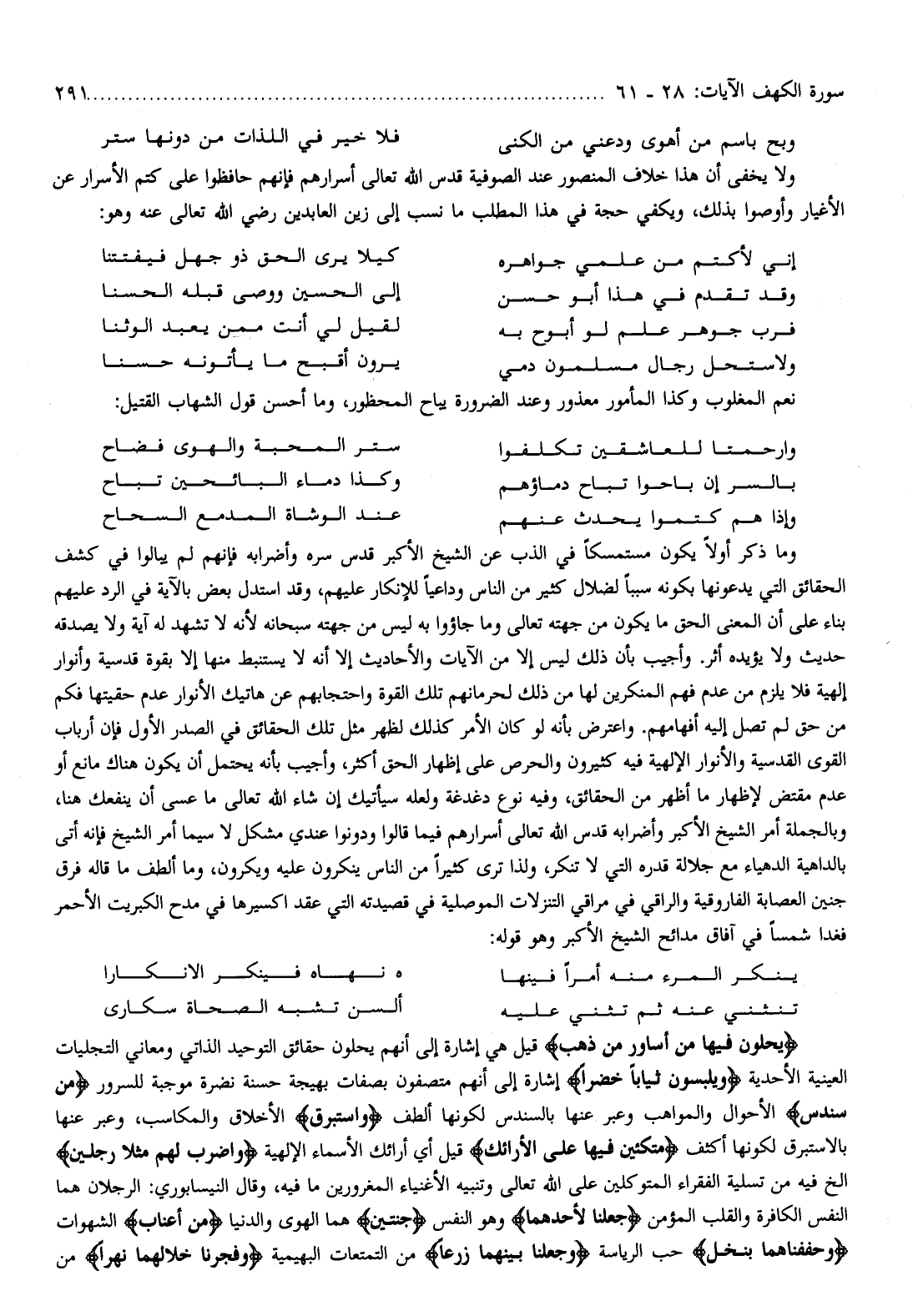 يُحَلَّوْنَ فِيها مِنْ أَساوِرَ مِنْ ذَهَبٍ قيل هي إشارة إلى أنهم يحلون حقائق التوحيد الذاتي ومعاني التجليات العينية الأحدية وَيَلْبَسُونَ ثِياباً خُضْراً إشارة إلى أنهم متصفون بصفات بهيجة حسنة نضرة موجبة للسرور مِنْ سُنْدُسٍ الأحوال والمواهب وعبر عنها بالسندس لكونها ألطف وَإِسْتَبْرَقٍ الأخلاق والمكاسب، وعبر عنها بالاستبرق لكونها أكثف مُتَّكِئِينَ فِيها عَلَى الْأَرائِكِ قيل أي أرائك الأسماء الإلهية وَاضْرِبْ لَهُمْ مَثَلًا رَجُلَيْنِ إلخ فيه من تسلية الفقراء المتوكلين على الله تعالى وتنبيه الأغنياء المغرورين ما فيه، وقال النيسابوري: الرجلان هما النفس الكافرة والقلب المؤمن جَعَلْنا لِأَحَدِهِما وهو النفس جَنَّتَيْنِ هما الهوى والدنيا مِنْ أَعْنابٍ الشهوات وَحَفَفْناهُما بِنَخْلٍ حب الرياسة وَجَعَلْنا بَيْنَهُما زَرْعاً من التمتعات البهيمية وَفَجَّرْنا خِلالَهُما نَهَراً من