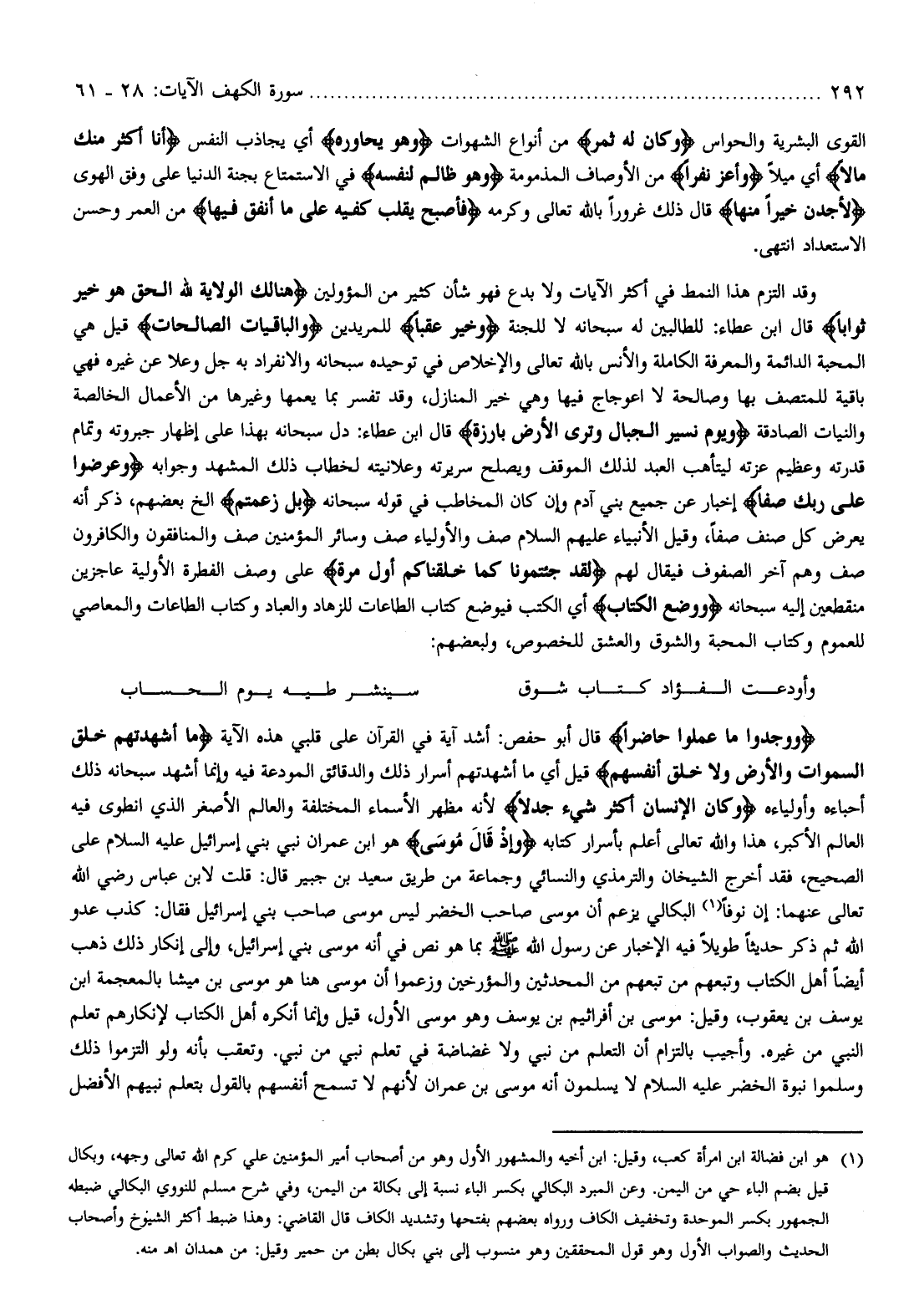 وَوَجَدُوا ما عَمِلُوا حاضِراً قال أبو حفص: أشد آية في القرآن على قلبي هذه الآية ما أَشْهَدْتُهُمْ خَلْقَ السَّماواتِ وَالْأَرْضِ وَلا خَلْقَ أَنْفُسِهِمْ قيل أي ما أشهدتهم أسرار ذلك والدقائق المودعة فيه وإنما أشهد سبحانه ذلك أحباءه وأولياءه وَكانَ الْإِنْسانُ أَكْثَرَ شَيْءٍ جَدَلًا لأنه مظهر الأسماء المختلفة والعالم الأصغر الذي انطوى فيه العالم الأكبر، هذا والله تعالى أعلم بأسرار كتابه وَإِذْ قالَ مُوسى هو ابن عمران نبي بني إسرائيل عليه السلام على الصحيح، فقد أخرج الشيخان والترمذي والنسائي وجماعة من طريق سعيد بن جبير قال: قلت لابن عباس رضي الله تعالى عنهما: إن نوفا (¬1) البكالي يزعم أن موسى صاحب الخضر ليس موسى صاحب بني إسرائيل فقال: كذب عدو الله ثم ذكر حديثا طويلا فيه الإخبار عن رسول الله صلّى الله عليه وسلّم بما هو نص في أنه موسى بني إسرائيل، وإلى إنكار ذلك ذهب أيضا أهل الكتاب وتبعهم من تبعهم من المحدثين والمؤرخين وزعموا أن موسى هنا هو موسى بن ميشا بالمعجمة ابن يوسف بن يعقوب، وقيل: موسى بن إفرائيم بن يوسف وهو موسى الأول، قيل وإنما أنكره أهل الكتاب لإنكارهم تعلم النبي من غيره. وأجيب بالتزام أن التعلم من نبي ولا غضاضة في تعلم نبي من نبي. وتعقب بأنه ولو التزموا ذلك وسلموا نبوة الخضر عليه السلام لا يسلمون أنه موسى بن عمران لأنهم لا تسمح أنفسهم بالقول بتعلم نبيهم الأفضل