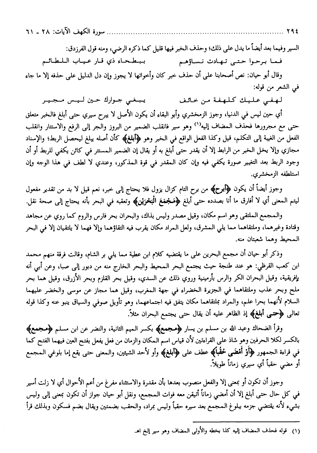 أي حين ليس في الدنيا، وجوز الزمخشري وأبو البقاء أن يكون الأصل لا يبرح سيري حتى أبلغ فالخبر متعلق حتى مع مجرورها فحذف المضاف إليه (¬1) وهو سير فانقلب الضمير من البروز والجر إلى الرفع والاستتار وانقلب الفعل من الغيبة إلى التكلم، قيل وكذا الفعل الواقع في الخبر وهو أَبْلُغَ كأن أصله يبلغ ليحصل الربط والإسناد مجازي وإلا يخل الخبر من الرابط إلا أن يقدر حتى أبلغ به أو يقال إن الضمير المستتر في كائن يكفي للربط أو أن وجود الربط بعد التغيير صورة يكفي فيه وإن كان المقدر في قوة المذكور، وعندي لا لطف في هذا الوجه وإن استلطفه الزمخشري.